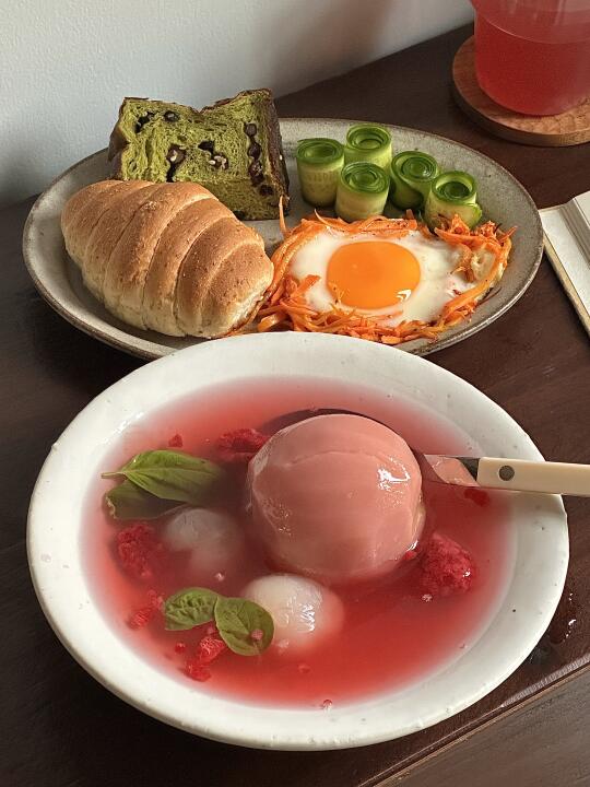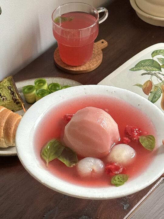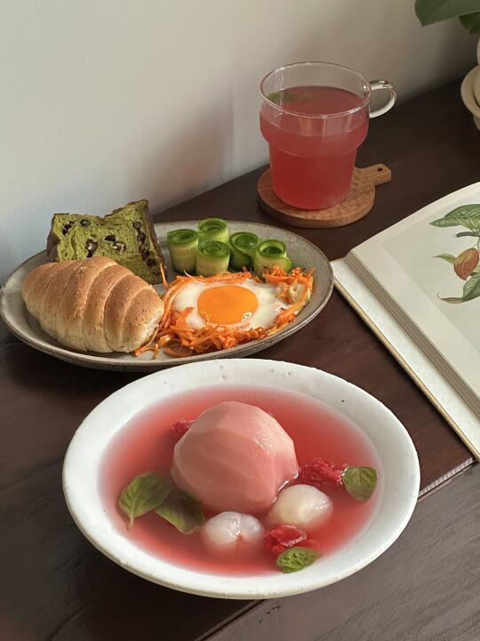 昨晚临睡前煮了桃子糖水 冷藏进冰箱糖渍一晚 早晨搭配抹茶碱水吐司与盐面包 熬过这个礼拜的梅雨季🍑