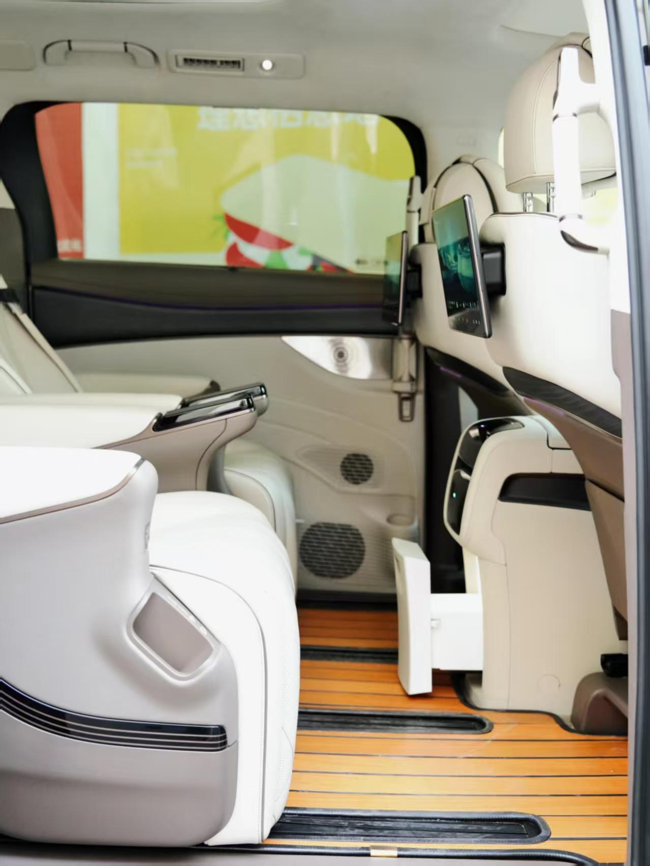 腾势D9二排航空座椅细节图!腿托升起挡住半个车窗,老外蜷在里面翘脚刷手机,真·移动客厅。