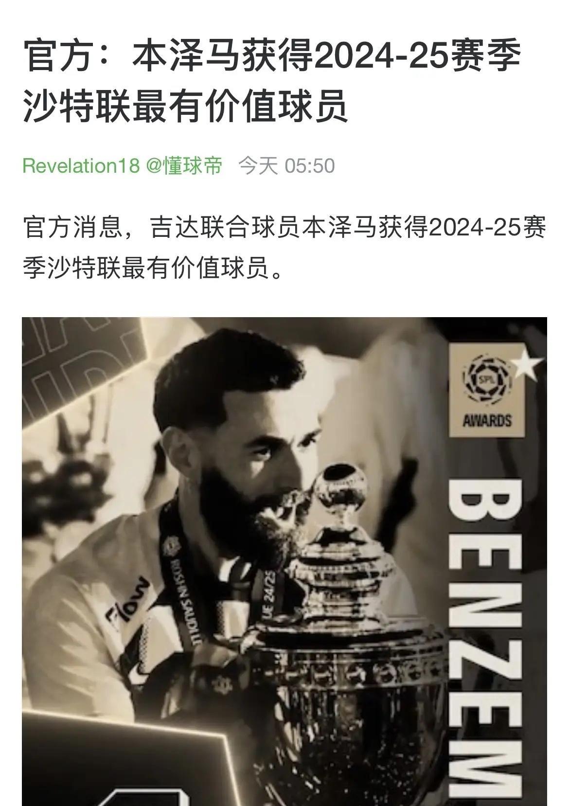 沙特联宣布,C罗当选上赛季球迷票选最佳球员。 虽然他是金靴奖得主,但不仅没有带队夺冠,反而带成第三名,丧失了亚冠资格,不得不去参加亚冠二级赛。 这样的表现,被评为最佳,也就只能是“球迷票选”了。不愧是评西王。 而真正的赛季最佳球员是冠军队吉达联合核心球员本泽马,获得官方奖杯。 地狱空荡荡,魔鬼在人间; 球场空荡荡,罗粉在网上。