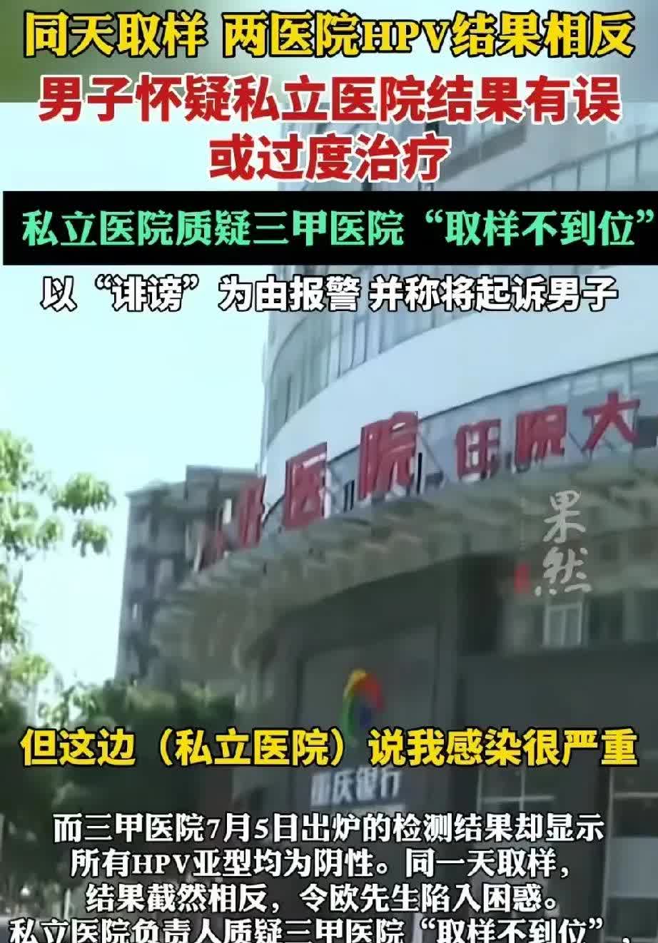 重庆,一男子隐私部位不舒服,同时去公立三甲医院和私立医院取样检查。私立医院先出的结果,告知男子感染HPV,而且容易导致癌变,男子在医院的安排下,接受激光、注射治疗花费1.9万余元。后来,公立三甲医院检测结果显示,男子并没有感染HPV。男子怀疑私立医院过度治疗,找他们讨要说法,私立医院:三甲医院取样不到位,男子诽谤,他们将起诉追究男子的法律责任。 男子无奈,向卫健委投诉该私立医院,不料,该私立医院却以男子诽谤为由报警求助,还声称要起诉欧先生。 法律上,诽谤需满足虚构事实并损害他人名誉的要件,但男子基于客观检测差异提出质疑,属于合法维权。 网友评论: 这种私立医院,应该三倍赔偿费用,同时相关职能部门应该罚私立医院到倾家荡产。这私立医院法人永远不得当如何单位公司等一切法人 中国资本主义,改变了人的灵魂,法律上的公平,执行上偏差,失去了公正。证明有钱走遍天下,有理寸步难行。成了现实谁能力及? 打着治病救人名号,恐吓危重病症捞钱,没病变有病,荒唐至极,政府卫生部门应该严查。 开放私立医院本身就让人看不懂,医院是私人的,从医生到护士,再到老板,那个眼晴不盯紧你的钱袋子,恨不得榨你三层皮,管你是死是活!