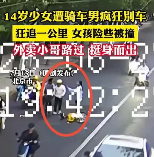 “太坏了!” 一14岁少女遭到骑车男疯狂别车,狂追1公里,把女孩往机动车上挤,差点导致女孩被撞,幸好外卖小哥路过,挺身而出! 这人黑,强烈要求警方抓起来,按危险驾驶罪判刑,否则,会继续危害他人。 外卖小哥太棒了,常做助人为乐的好事儿!杯男子变态了吧!谢谢你外卖小哥帮助小女孩儿! 在某些有钱人的眼里,在现今社会上,工地搬砖的、骑单车送外卖的,都是下等人。但是,见义勇为者、多为外卖小哥!这是一个可歌可泣的群体,为了那点微薄的收入,泣血捐躯。