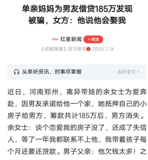 “太过分了!”7月16日,河南郑州,31岁离异女子带个孩子,因草莓结缘一男子,男子许诺会照顾她和孩子,给她一个稳定的家,女子有一89平的房子,男友嫌小要换个100多平的大房子,便用女子房子贷款买新房,先后贷款185万,结果房子没买,男友消失了,女子崩溃找到男友爸爸,哭诉:他让我房子没了,又要成为失信人,不料,男友爸爸一番话让人惊讶! “我掏心掏肺谈恋爱,房子没了!还得拖个孩子当失信人,这日子咋过!” 余女士(化名)崩溃大哭并喊道。 余女士离异后独自带娃,日子不算轻松,但也平静。一次买草莓的契机,她认识了一个男子。男子很会关心人,对余女士也十分好,俩人聊了很久,对彼此都有好感,男子也不在意余女士结过婚有孩子,所以俩人走到了一起。 该男子知道她独自带娃不易,承诺会好好照顾她和孩子,给她们娘俩一个稳定的家。余女士本就渴望温暖,渐渐就对男子动了心,两人正式谈起了恋爱。 恋爱后,男子却开始嫌余女士的房子小。余女士那套 89 平的房子,是她辛苦攒下的安身之所,可男子总说他们得换个 100 多平的大房子,才配得上以后的日子 。 余女士一开始没往心里去,可架不住男子天天念叨,说换了大房子,一家人住得宽敞,生活才更有奔头,还反复许诺会和她好好过日子,娶她进门。余女士心软了,也憧憬起未来的生活,便听了男子的话,用自己的房子作抵押去贷款买新房。 前后折腾下来,贷款总共贷了 185 万。可钱贷出来了,新房却压根没买成,更让余女士崩溃的是,男友直接消失了!电话打不通,人也找不到,仿佛人间蒸发。余女士一下子慌了神,她带着孩子,每个月还要还 2000 多块钱的贷款,原本的生活全被打乱。 房子没了,自己还因为贷款这事,眼看着要成为失信人,未来孩子上学和他们生活说不定都要受影响,余女士越想越崩溃,四处打听男友的消息,最后找到了男友的爸爸。 余女士见到男友爸爸,哭诉着说,他让我房子没了,现在自己还得带着孩子,马上要成失信人了,说这可咋办啊!本以为男友爸爸会推诿,没想到对方一番话挺让人惊讶。 男友爸爸说他欠钱太多!之前家里拆迁补出来 600 多万,不知道他为什么还欠钱?他让我给你一套房子。 这话一出,余女士心里又是一阵复杂,可房子的事儿还没个准信,男友依旧联系不上,未来的日子依旧像团迷雾。 这事在网上传开后,网友们也炸开了锅。有网友说:“这女的太傻了,谈恋爱咋能把自己房子拿去抵押,男方说啥就信啥,可怜之人必有可恨之处啊。” 现在余女士还在艰难应对每月的贷款,一边等着男友能出现给个解释,一边也盼着男友爸爸所说给一套房能真正落实,让自己和孩子的生活重回正轨。 这场恋爱,给余女士带来的不是温暖的家,而是一连串的麻烦,希望她最终能得到一个妥善的解决,也给其他在感情里容易冲动的人提个醒,涉及重大财产决策时,真得多留个心眼 。 对于这件事,大家有什么想说的呢?欢迎在评论区分享。 信源:红星新闻 2025年7月16日