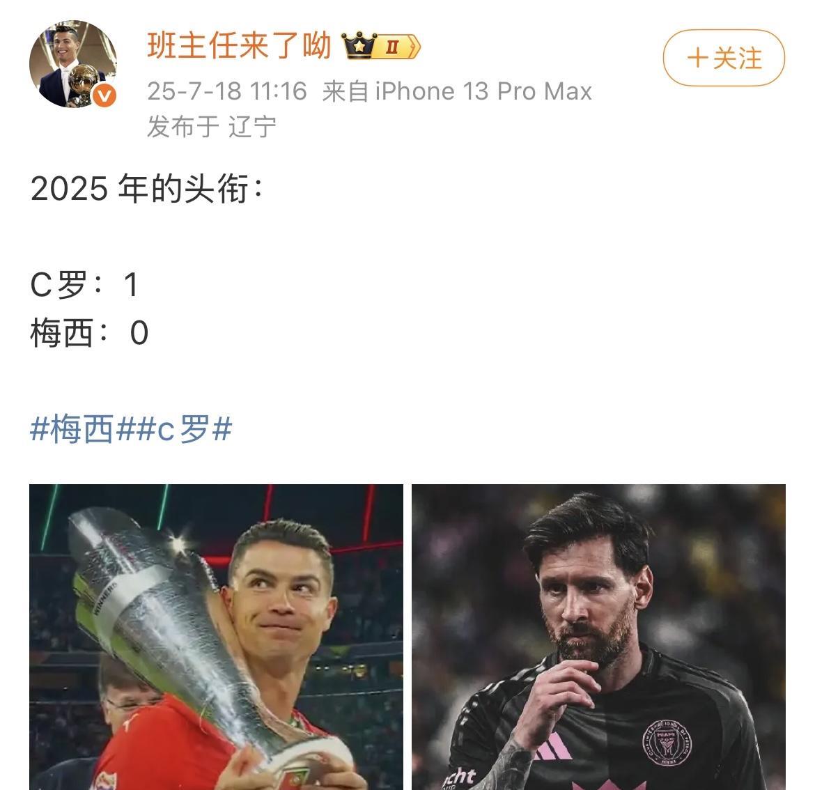 C罗粉丝比较“2025 年”梅罗两人的冠军: C罗:1 梅西:0 沙特联是跨年度赛制,24-25赛季已经结束了,欧国联也在赛季范围内。C罗在俱乐部四大皆空,也就能弄个国家队友谊赛冠军。美职联是自然年赛事,刚打完一半多,还分常规赛和季后赛,何况还有北美联盟杯。 自己的比赛完了,拿个友谊赛冠军显摆,和正在进行中的别人比较,证明自己强。这种把戏不可笑吗?