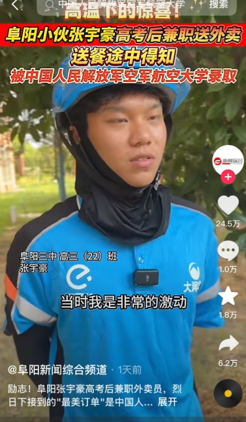 安徽阜阳,一男生高考之后去兼职送外卖,就在送餐途中,他收到班主任发来的消息,得知是被中国人民解放军空军航空大学录取,他说当时非常激动与开心!