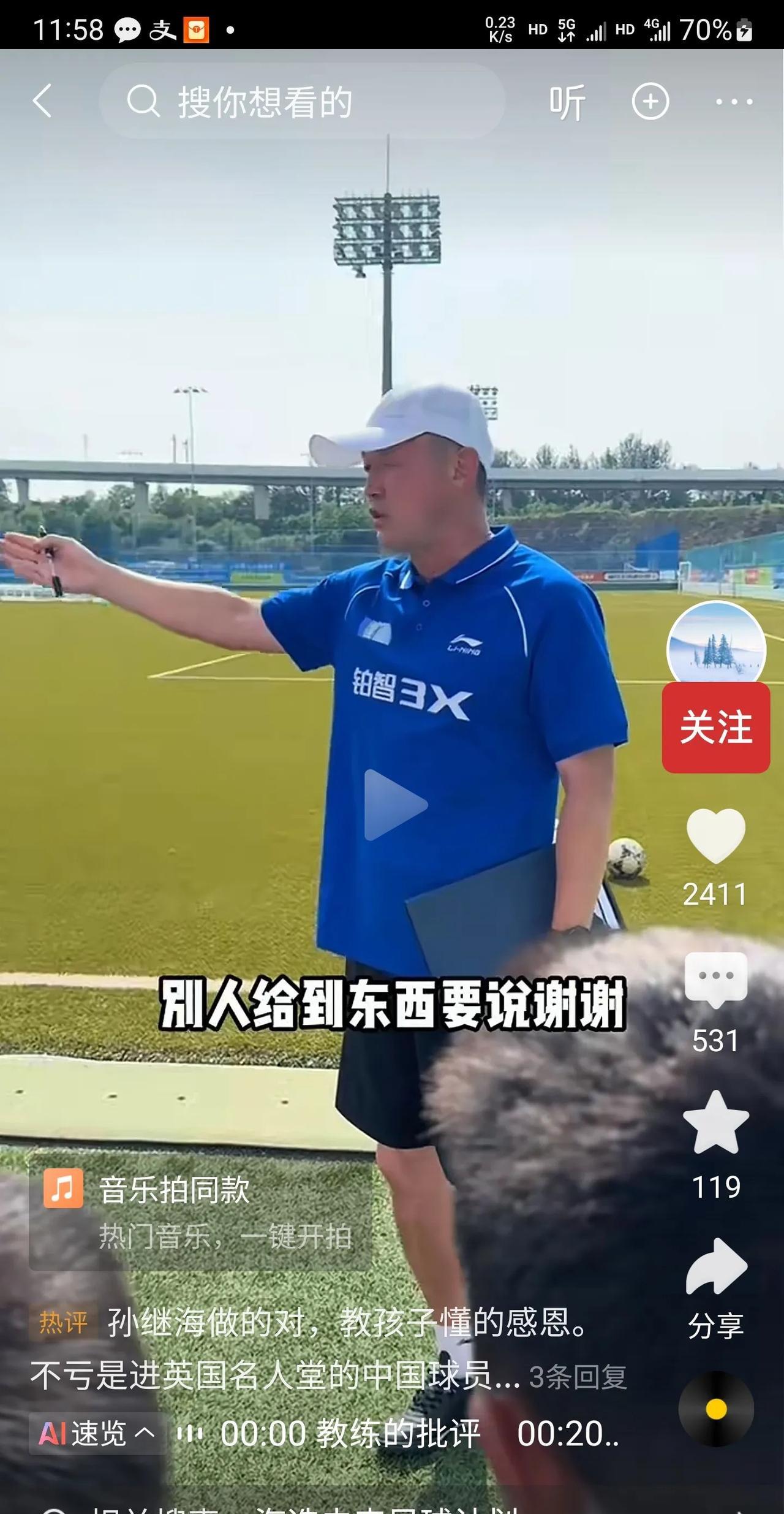 这次必须为孙继海指导点赞! 新学员在第一堂课从教练手中领训练背心的时候,只有五个孩子是双手接过来,更没有一个孩子说谢谢! 可气的是,孙指导在问到有谁说谢谢了,请举手。 还真有一个孩子高高举起手!不过随后孙指导毫不留情的说:“把手放下来。你可以不对教练说谢谢,但你不能撒谎。” 随后,孙指导说:“你们都过来,都要看见我。”并指着外面的孩子家长说:“你们的家长都能看到吗?我们想让孩子成为什么样的人?” “来这里不只是踢球,首先要成为一个好人。以后从别人手里拿东西要双手接过来,要说谢谢。” 做事先做人,细节见成败。 你可以没有多少天赋,可以成不了梅西。但要成为一个对社会有用的人,成为一个好人。 我们的教育很多时候就是以成绩论英雄,忽略了如何做人。 孙指导可能也接受了前段时间被18万损失费的教训。从做人的点点滴滴入手,你可以不对教练说谢谢,但你不能撒谎! 那个张卓毅妈妈看了会不会红红脸,出出汗呢?
