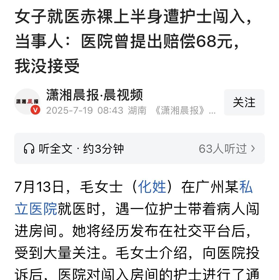 广东广州,女子在一家私立医院做心电图,谁知,就在她露着上半身躺在床上检查时,一名护士突然带着患者掀开帘子闯了进来,看了一眼后离开了,女子觉得自己被看光了,十分屈 辱,她向医院要说法,院方表示可以赔偿她68块,女子直呼无法接受。 潇湘晨报·晨视频报道,7月13号那天,在一家私立医院里,毛女士遭遇了一场让她至今想起来都心有余悸的事儿。 当时她正在这家医院体检做心电图,整个人处于一种比较私密和放松的状态,衣服撩到了胸口,上半身基本是露的。 检查室的门没锁,就靠一道帘子隔着外面的视线,她原本以为这样能保障自己的隐私。 可谁能想到,就在她平躺在检查床上,等着检查顺利完成的时候,意外突然就来了。 一位护士带着另一个病人,直接就闯进了检查室。 当时前台的护士还试图劝阻他们,可根本没用,这护士和病人还是硬生生地闯了进来。 他们进来后,只是看了一眼,然后就又退出去了。 但就这么一眼,对毛女士来说,却像是一场噩梦的开端。 毛女士后来跟记者回忆起当时的场景,声音里还发颤。 她说自己当时完全懵了,大脑一片空白,就感觉自己的隐私被彻底暴露在了陌生人面前。 那种羞耻感和愤怒一下子就涌了上来,让她整个人都慌了神。 负责给她做检查的工作人员也注意到了她的情绪变化,发现她因为这件事心率出现了波动,就让她多躺5分钟,调整调整状态。 可毛女士哪能那么快平静下来啊,她一边躺在床上,眼泪都被气出来了,脑子里全是自己被看光的画面,越想越觉得委屈。 等毛女士稍微缓过来一点之后,她找到了那位闯进检查室的护士。 护士给出的解释是,有患者需要检查,情况比较紧急,所以才会闯进去,还简单地跟毛女士道了个歉。 但在毛女士看来,这个理由根本站不住脚。 她觉得就算有患者要检查,也不能不顾别人的隐私,就这么强行闯进来啊。 毛女士越想越气,于是就拍下了护士的工牌,向医院进行了投诉,还在平台上给这家医院写了差评,把自己这次不愉快的经历都说了出来。 这件事在社交平台上引起了不小的关注,很多网友都对毛女士的遭遇表示同情,同时也对医院的管理提出了质疑。 7月14号,医院对这名护士和所在的科室进行了通报批评。医院这么做,也算是给了毛女士一个初步的交代。 之后,毛女士也删除了在平台上的差评,她想着既然医院已经处理了,那就先看看后续的情况再说。 不过,医院虽然对护士进行了处罚,但在赔偿问题上,却让毛女士不太满意。 医院提出赔偿68块钱,毛女士觉得这钱根本无法弥补她所遭受的精神伤害。 她想要的,是一封来自医院的正式道歉信,她觉得只有这样才能让她感受到医院对这件事的重视,才能让她心里的那口气稍微顺一点。 这件事到现在还没有完全解决,毛女士还在等着医院给她一个满意的答复。 而对于医院来说,这次事件也给他们敲响了警钟,如何在保障患者就医效率的同时,更好地保护患者的隐私,是他们必须要认真思考和解决的问题。 那么,从法律角度,该怎么看待毛女士的遭遇? 《民法典》第1032条规定:自然人享有隐私权。任何组织或者个人不得以刺探、侵扰、泄露、公开等方式侵害他人的隐私权。隐私是自然人的私人生活安宁和不愿为他人知晓的私密空间、私密活动、私密信息。 毛女士在医院检查室进行心电图检查时,上半身赤 裸,这一场景属于其不愿为他人知晓的私密活动,检查室虽未锁门但靠帘子遮挡,形成了相对私密的空间。 护士不顾前台劝阻,强行带着病人闯入检查室,这一行为直接侵犯了毛女士的私人生活安宁,使其私密活动暴露在陌生人面前,符合以“侵扰”方式侵害他人隐私权的情形。 医院有义务保障患者在就医过程中的隐私不受侵犯,护士的行为显然违反了该规定。 《民法典》第1165条规定:行为人因过错侵害他人民事权益造成损害的,应当承担侵权责任。依照法律规定推定行为人有过错,其不能证明自己没有过错的,应当承担侵权责任。 护士作为医院的工作人员,在执行工作任务过程中,因未充分考虑患者隐私保护,强行闯入毛女士的检查室,存在明显过错。 该过错行为导致毛女士的隐私被侵犯,给毛女士造成了精神上的损害,如出现情绪波动、流泪,脑子里不断回想被看光的场景等。 根据此法条,护士的行为构成了侵权,应当承担相应的侵权责任。 医院提出赔偿68元,可视为对侵权损害的一种经济补偿尝试,但毛女士认为该赔偿无法弥补其精神伤害。 这反映出在确定侵权责任赔偿范围时,需要综合考虑侵权行为造成的实际损害后果,包括精神损害等方面,以确保受害者的合法权益得到充分保障。 对于毛女士的遭遇,你怎么看?