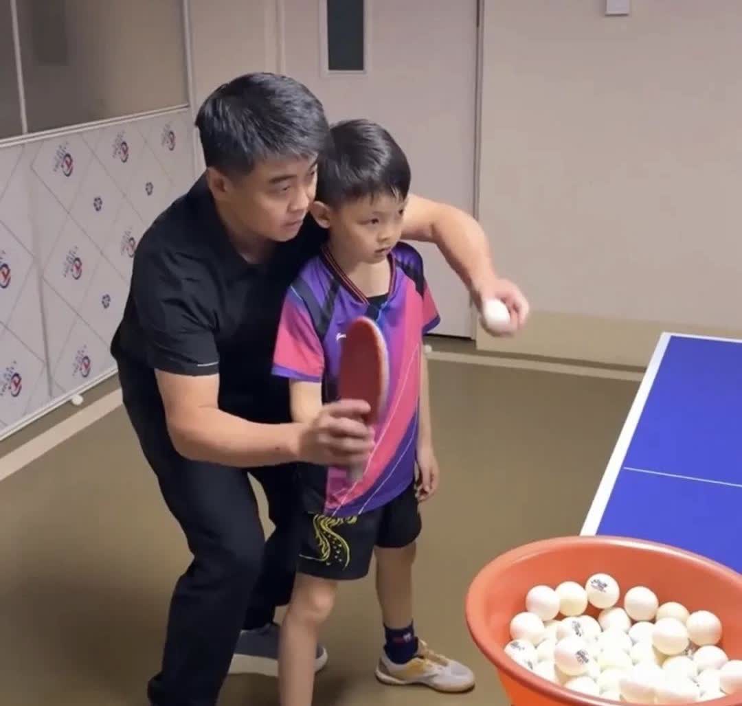 王楚钦小时候追着王皓学,结果现在王皓的小儿子追着王楚钦学,还完美避开了王皓的直板