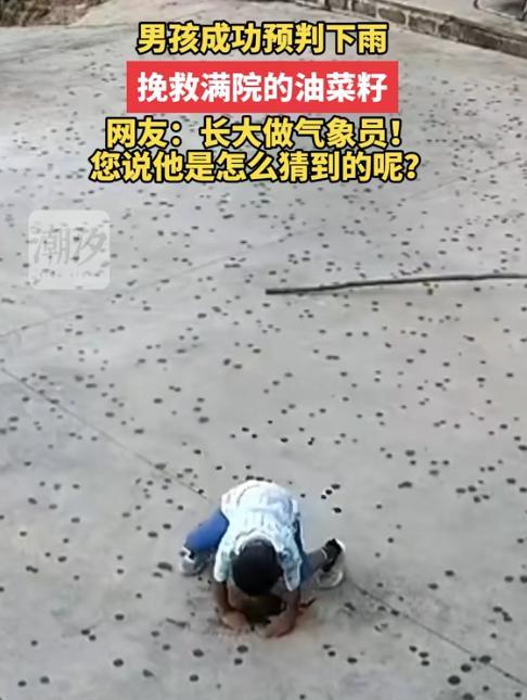 贵州,一个6岁小男孩在自家院子里溜达,突然他对奶奶说马上要下雨了,奶奶说大晴天的哪里有雨,男孩说他听到了雨的动静,奶奶不相信,结果下一秒竟然真的下雨了!男孩帮助奶奶收拾菜籽还用身体挡住菜籽不被雨淋。有朋友说:“我儿子是用闻的,他说闻到下雨的味道,当天就真的下雨!” 事后男孩的妈妈道出了事情的真相,其实男孩发现下雨的规律并非偶然,原来小男孩天天(化名)对天文方面本身就有着浓厚的兴趣,平常看手机并不是和别的孩子一样,就知道打游戏,看电视。 而是喜欢看一些天文地理知识类的视频,我们都低估了小孩子的理解能力,从这些视频之中,天天潜移默化下学到了一些知识,再加上,父母总是带着他去乡下玩耍,玩耍期间遇到大自然的迹象,也会给天天讲解,从玩耍之中给他灌输一些知识,而天天也从玩耍之中,对自己在网上看的知识无形之中实践。 渐渐的真就获得了一些真本领,每当下雨前,他的耳朵都能听到雨水来临前的前奏,前段时间他预测过下雨,并赶回家中让奶奶赶紧把院子里面的菜籽给收了,可奶奶那个时候就是不愿意相信,看着晴空万里的,还以为天天在说瞎话,所以固持己见无动于衷,结果没过一会就下了大雨。 打了她一个措手不及,她赶紧回屋子里面拿塑料布,将菜籽严严实实的盖住,毕竟短时间内根本收不了,还会导致菜籽淋湿。 而这一次,天天再次预测下雨,奶奶嘴上还是不太相信,质问天天他咋知道的,天天理直气壮的表示耳朵听的,随后和奶奶俩人一起收菜籽,巧合的是,菜籽刚收完,还剩下最后一点点之时,真的就下雨了。 懂事的天天在奶奶转头拿工具的时候 ,用自己小小的身躯为菜籽遮挡雨水。 事后天天家人将此段监控视频发到了网上分享,没想到瞬间爆火,大家称赞天天是气象局局长,也好奇一个孩子的耳朵,怎么就比我们手机里的大数据和卫星云图还准? 原来小孩子的感官远超与成年人,他们能够听到且察觉到大自然中细微末节的声音和感受,而天天又刚好懂得一些知识,结合自己的感受,发现大气剧烈活动会产生次声波,就能精确的感受到雨水的来临。 这故事提醒我们自己,偶尔也该抬起头,用自己的感官去读一下这个世界。 对此您怎么看?