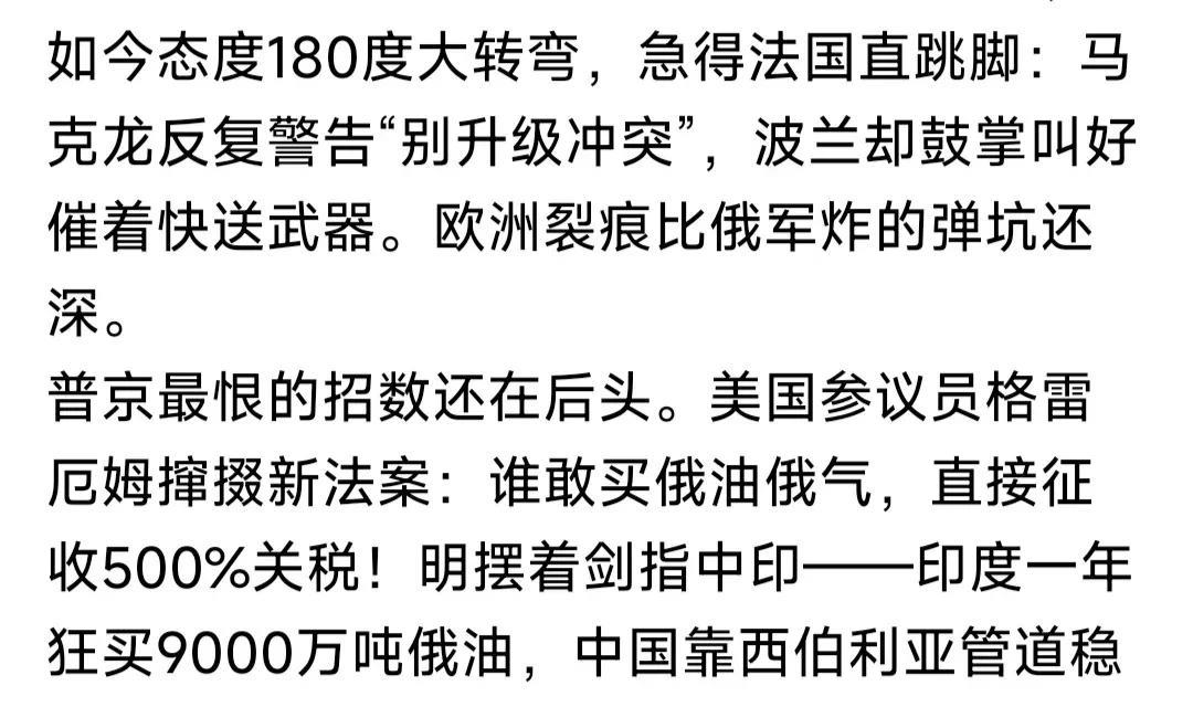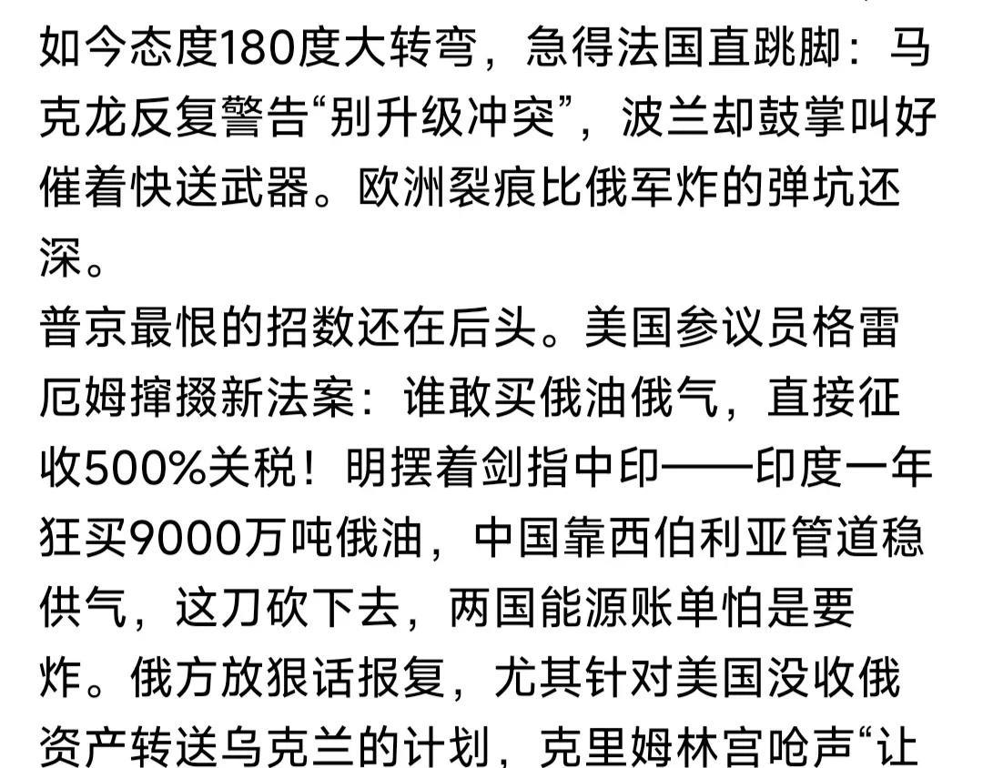 美国353:76通过决议,继续援助乌克兰!其中民主党212票支持;共和党141票支持,76票反对!9票弃权。 这是真的吗?网友发的这个图文,是刚发生的事情吗?有懂英文的网友,请翻译一下,图片三内容是否属实? 如果是最新消息,川普就跳不出“如来佛”手心,只能在援乌路上继续前行!这事由不得他,国会说了算啊! 随后参议院通过,也是大概率事情。因为此前格雷厄姆推动对俄“二级制裁”法案,100名议员就获得84人支持! 这个结果,与苍狼预测重合!苍狼早就说过,只要乌战仍在进行,美国就会持续援乌!这个事情由不得特朗普。 参众两院支持援乌,这是美国精英意识决定的!美国是世界老大文明灯塔!绝不会在俄乌战争问题上放弃原则! 至于援助多少?援助什么?援助武器弹药谁掏钱?是细节问题,特朗普说欧洲掏钱,是一厢情愿,可能一部分? 当下俄乌僵持,俄方前线猛攻;乌军地面防守,远程攻击俄后方目标!双方都很艰难,但都不想放弃既定目标! 川普抛出50天缓冲期,如果到时双方不停火,将对俄实施“二级制裁”!普京表示不怕,真的不怕还是装硬汉? 这50天缓冲期,将是俄乌双方最困难时期!乌有武器优势,但兵力不如俄;俄有兵源优势,电子情报不如乌! 各有优势劣势,就看谁出奇制胜?乌方相对更难一点,但有美欧援助,绝不至于崩溃。且等50日后,再看分晓? …………