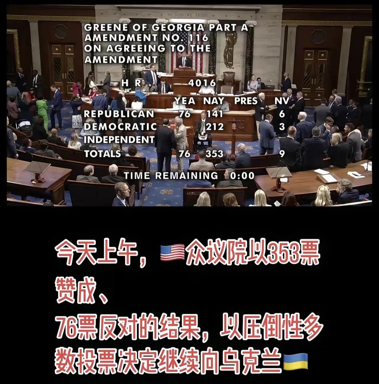 美国353:76通过决议,继续援助乌克兰!其中民主党212票支持;共和党141票