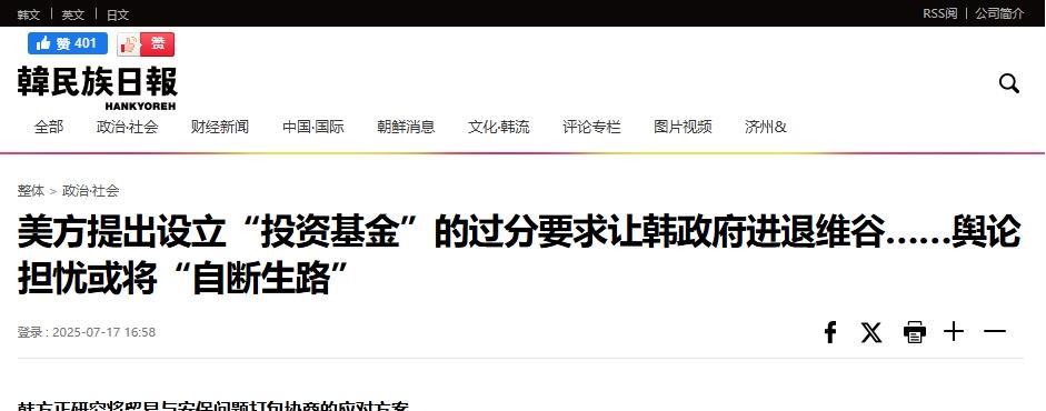 美国要求韩国打钱:4000亿美元,一分都不能少 日前韩媒《韩民族日报》爆料称,在近期的韩美关税问题谈判中,美国商务部长卢特尼克向韩方提出要求,即效仿日本设立一个千亿美元投资基金,以扩大韩国企业对美投资。 报道称,这一设想源于日本政府在与美国谈判时提出的方案之一,日本软银集团董事长孙正义提议设立一个3000亿美元的对美投资基金,目前美日正在就此事进行磋商。 但显而易见的是,美国方面对这个基金方案很感兴趣,因为卢特尼克给韩国开出的基金注资标准是4000亿美元,比日本还多。 至于韩国方面的态度,则是“对此感到颇为棘手”:一方面,现阶段韩国的经济状况决定了李在明政府无法拿出这么一大笔资金; 另一方面,即使韩国真有这笔钱,李在明设立对美投资基金、支持赴美设厂的举动可能会被视为与本国制造业形成竞争,进而遭到反对党指责。 此外,韩媒还批评美国对韩国狮子大张口的同时,却不愿在关税问题上做出让步,尤其是在韩国对美出口汽车上,美国仍坚持征收25%的关税。 但显然,韩媒的不满牢骚没有任何用。韩国的实力和地位,以及美韩同盟的“特殊关系”决定了韩国无力反抗特朗普的敲诈勒索。