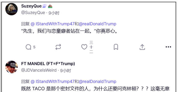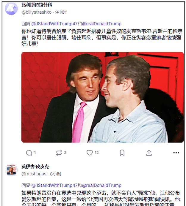 现在,特朗普的铁粉们已经乱成一锅粥了。只要有人敢在特朗普的帖子下面说一句好话,立马就会被其他粉丝围攻。这说明啥?说明特朗普的人设已经崩塌了!爱泼斯坦案就像一颗炸弹,彻底引爆了特朗普和他的粉丝之间的信任危机。