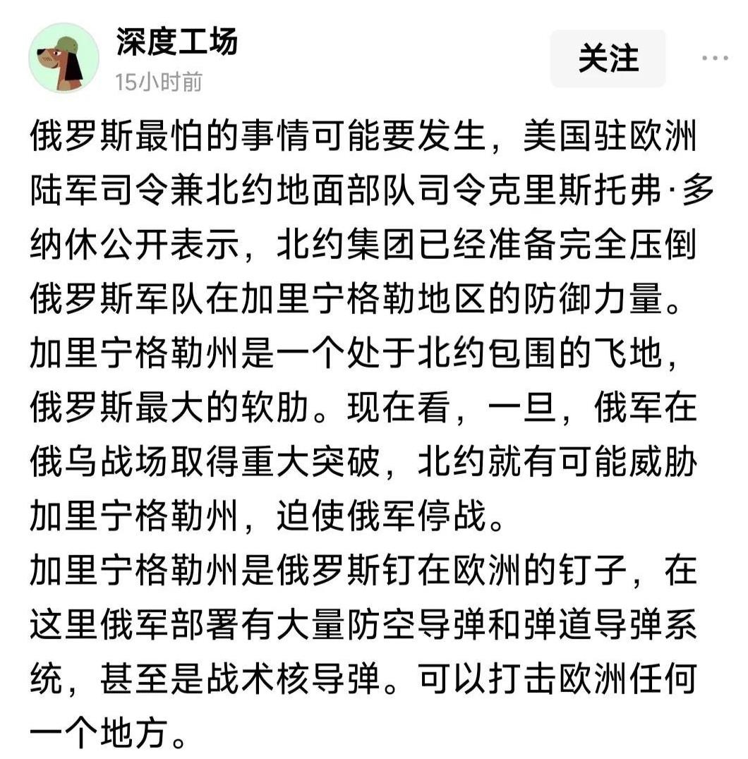 美驻欧陆军司令:为逼迫俄停战,随时准备占领加里宁!多纳休也是北约陆军总司令,他的话十分有分量! 普京强硬回应:若美欧胆敢如此,就是对俄宣战!俄将用一切手段反击!战术核武器可打击欧洲任何地方! 北约司令为何如此放话?原因有三: 1.加里宁是俄飞地,也是最大软肋。位于波兰与立陶宛之间,与俄本土太远,北约若想拿下,不是难事! 2.乌战事关乌克兰存亡,也关乎欧洲安全,更涉及北约威信!美欧不会允许俄侵吞乌,这事必须管到底! 3.战争已打三年,各方十分疲倦!美欧 推动停战,俄乌要价不同!打到何时为止?也许只能快刀斩乱麻? 普京为何强硬?威胁不惜动用核武予以回应?只因加里宁分量,比乌更重!一旦失去,是对俄的羞辱啊! 1.苏联二战后解体,华约分崩离析!15加盟国独立,俄作为苏联遗产继承国,仅剩加里宁是唯一二战成果! 2.如果失去,情何以堪?何颜面对世界?曾经与美分庭抗礼,至今仍不惧任何国家的大鹅,如何立足世界? 3.鉴于以上原因,普京才强硬回应,不惜动用核武器反击,打击欧洲的任何地方!甚至可能核打击美国本土! 但看俄乌战争趋势,各种迹象表明:正朝那个危险方向发展!俄不撤军,乌要抵抗,美欧不让乌败援助到底! 至于俄威胁核武反击?美英法没有核武吗?何况现代核战,看的并非是核弹多少?而是防御拦截反击能力吧! 当然不排除俄用核武!但只要敢用,就是核大战!如果核战不解决问题,那就是世界三战了!但愿不要发生! …………