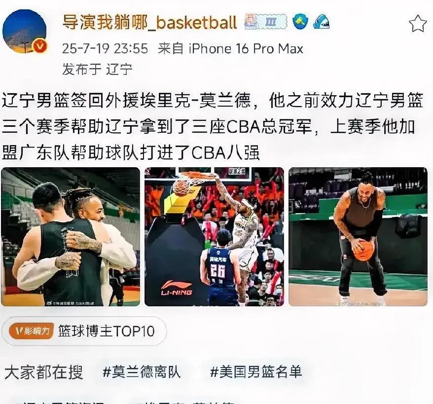 让辽宁球迷蹦起来的消息来啦!辽宁男篮签回外援莫兰德! 据媒体人“导演我躺哪”爆料,辽宁男篮成功签回了埃里克-莫兰德!此消息一出,立刻引发了球迷的热议!此前就有球迷揣测,辽宁男篮近期已向莫兰德抛出了橄榄枝,没想到,这个消息还真就成为了事实,看来前不久莫兰德在个人社媒上删除了所有与广东宏远的视频,是事出有因的,恭喜莫兰德加盟辽宁男篮。#辽宁男篮##辽宁本钢# #莫兰德# #莫兰德回归辽宁男篮#