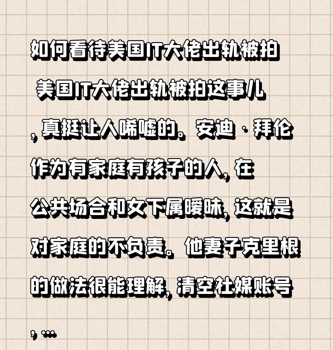 如何看待美国IT大佬出轨被拍 美国IT大佬出轨被拍之事,着实令人喟叹。安迪·拜伦,一个已有家室且育有子女之人,竟在公共场合与女下属举止暧昧,这无疑是对家庭的一种不负责任的表现。他的妻子克里根的做法是很容易被理解的,她清空了社交媒体账号,还把夫姓给删掉了,想必是心灰意冷了吧。