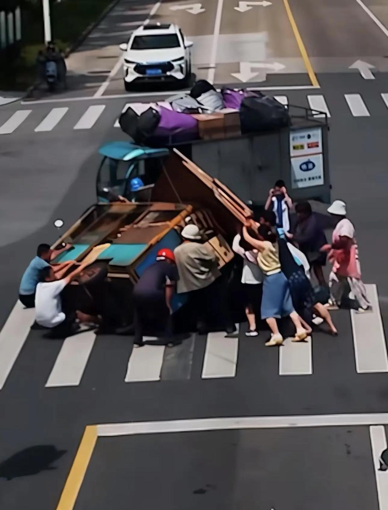 “这一刻,众字具象化了!”江苏泰州,载满货物的三轮车侧翻,把电动车上的3人压在车