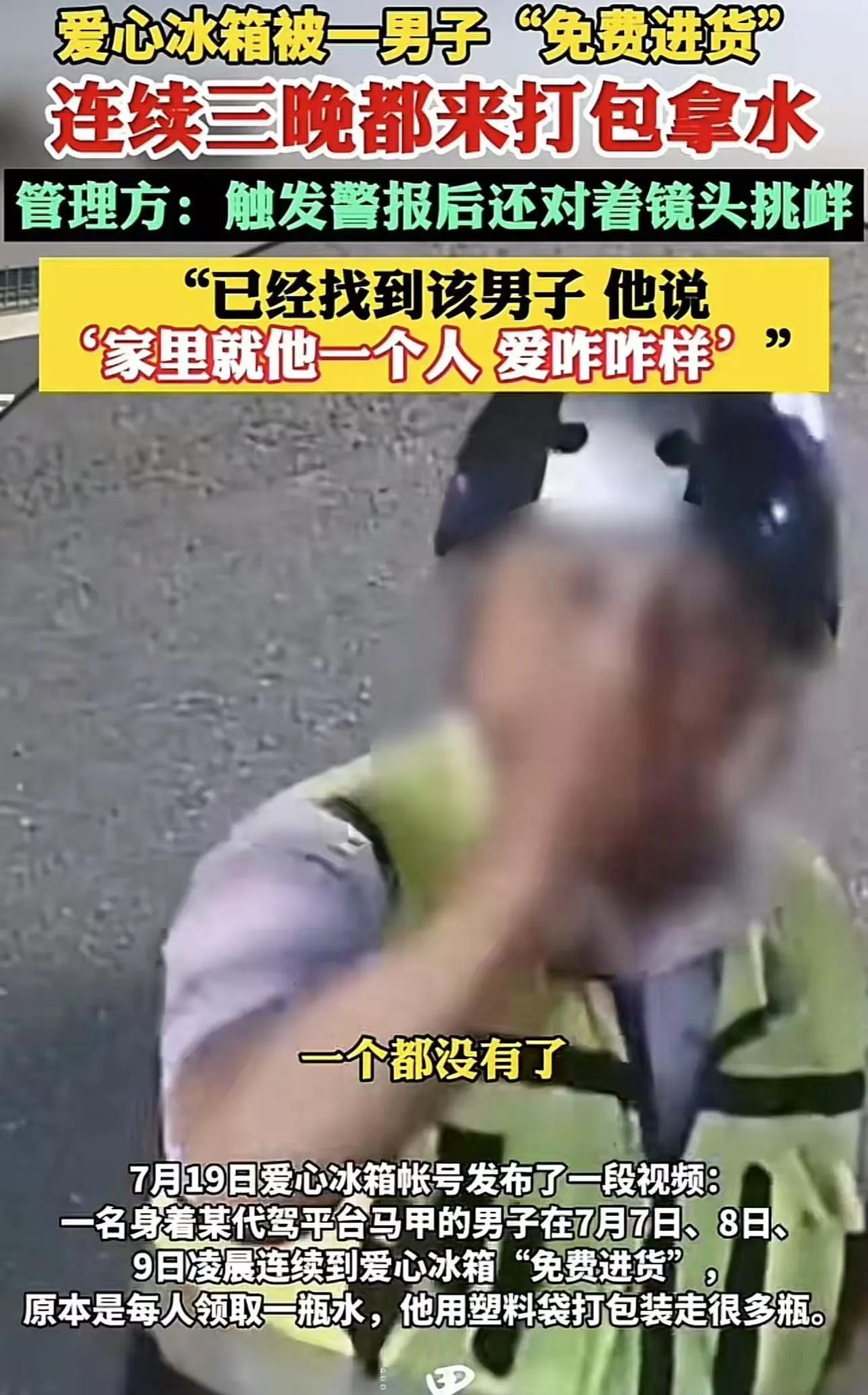 太嚣张了!浙江杭州,爱心冰箱被男子“免费进货”,连续三晚都来打包拿水。管理员:触发警报后还对着镜头挑衅!找到他后,他还说反正家里就他一个人,爱咋咋样!网友:一个人怎么了,拘了他也不是难事! (来源:逐浪视频) 这个爱心冰箱,在杭州已经3年多了。它设立的初衷,是为那些在烈日下挥洒汗水、为城市正常运转而辛勤劳作的环卫工人、外卖员以及其他户外工作者提供一份清凉与便利。 冰箱旁明确张贴着规则:每人每次仅能拿取一瓶水。可是,这份美好的善意却被一个代驾男子的行为无情地打破了。、 这个男子几乎每次都在凌晨时分悄然现身,然后进行“打包”行动,一次性拿走多瓶水。 他的这种行为,与爱心冰箱设立的初衷背道而驰,将公共资源变成了自己的私人储备。 有一次,冰箱里的水被一扫而空,他竟对着监控,满脸不耐烦地质问:“怎么一个都没有了?”那语气,仿佛冰箱里的水本就是他应得的。 更过分的是,当监控触发警报时,他不仅没有丝毫的收敛,反而故意对着镜头比出挑衅的手势,那嚣张的模样,仿佛在向整个社会的公序良俗发起挑战。 他就像一个贪婪的小偷,冰箱里有多少水,他就带走多少,全然不顾那些真正急需补水的人。 爱心冰箱的管理人员发现这一情况后,出于善意和包容,找到该男子,希望他能够收敛自己的行为,遵守规则,让这份爱心能够惠及更多需要的人。 可没想到,男子却满不在乎地回应:“我反正就光棍一个,我无所谓的,你想怎么样就怎么样!” 这副无赖的嘴脸,让人感到无比愤怒和心寒。于是管理人在忍无可忍之下,将这件事情发到了网上进行曝光。 有的网友义愤填膺地说:“为啥他家就他一个人是有原因的!放心让这种人代驾吗,不知道哪天会对顾客做出啥事?” 也有的网友说:“其实这种爱心冰柜在中国不太适合,因为我们有部分的劣质人种贪得无厌!” 还有一些网友说:“可能他生活确实困难,不必上纲上线吧?本来就是爱心,给谁不是给?” 我想说的是,爱心冰箱设立的初衷是让每一个在户外辛苦工作的人都能在需要的时候喝上一口水,临时解渴、喝水救急,这是爱心冰箱存在的意义所在。 但这个代驾男子的行为,已经远远超出了合理使用的范畴。他每天成件成件地拿水,完全不顾及其他人的需求,这种行为无疑是对爱心的亵渎和对规则的践踏。 这份善意,本就是为那些真正在高温下坚守、为城市付出的人准备的,而不是成为某些人满足私欲的工具。 当然,爱心冰箱依靠人们的自觉来维持秩序很难。为了避免类似的“爱心劫持”事件再次发生,有必要对爱心冰箱的管理方式进行改进。 可以采用人脸识别或者手机号领取的方式,规定24小时内只能限量领取两瓶水,这样的措施相对可以避免多拿的情况发生,爱心才能真正发挥出它的力量,温暖每一个需要的人。 我们绝不能让个别人的贪婪和无赖,凉了全社会那颗滚烫的爱心!#头号创作者激励计划#