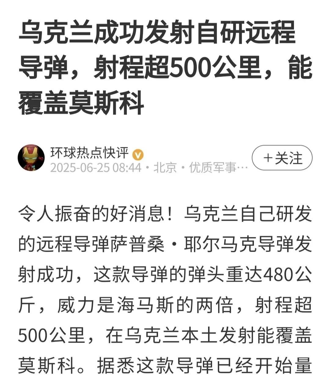 乌自研成功射程超500公里导弹!可覆盖莫斯科与圣彼得堡,保家卫国又添利器,鹅熊导弹已无优势! 战争三年,此消彼长!鹅熊初有空中优势,但美欧援乌防空系统,乌无人机越境攻击俄机场,摧毁预警机与战略轰炸机,俄空中优势已失去! 但俄的高音速与远程导弹,仍然占据优势。美英法虽援乌陆军战术导弹,暴风阴影与铁锤导弹,但只允许短程攻击,不能远程打击纵深目标! 近期美英德法放开限制,允许用其导弹攻击远程目标,但毕竟数量有限,无法打击想打的目标。现在有了自研远程导弹,使用就比较自由了! 忽然想到德国“金牛座”!据说威力大射程远,能炸刻赤大桥,能打莫斯科圣彼得堡。小泽一直想要这种导弹,舒尔茨怕惹怒鹅熊,一直没给。 默茨上台承诺要给,好像也没动静!是否议会有阻力,让他不能如愿以偿?既然不让公开给乌,暗中转让技术,让乌自己生产还有什么话说? 默茨早就宣布,德要在乌建厂,双方联合生产武器。这款射程500公里远程导弹,是否“金牛座”转型产品?管它是不是,能打500公里就行! 如果真是这样,除了核武器,鹅熊再无优势可言!你敢炸我基辅敖德萨,我就炸你莫斯科圣彼得堡!咱们对等互炸,看谁耗得过谁?谁怕谁? 当然最好结果,还是如中美欧期望,俄乌停火进行和谈,两国实现和平!对两国发展,两国人民福祉,都是最好的选择!继续再打人民遭难呐! …………