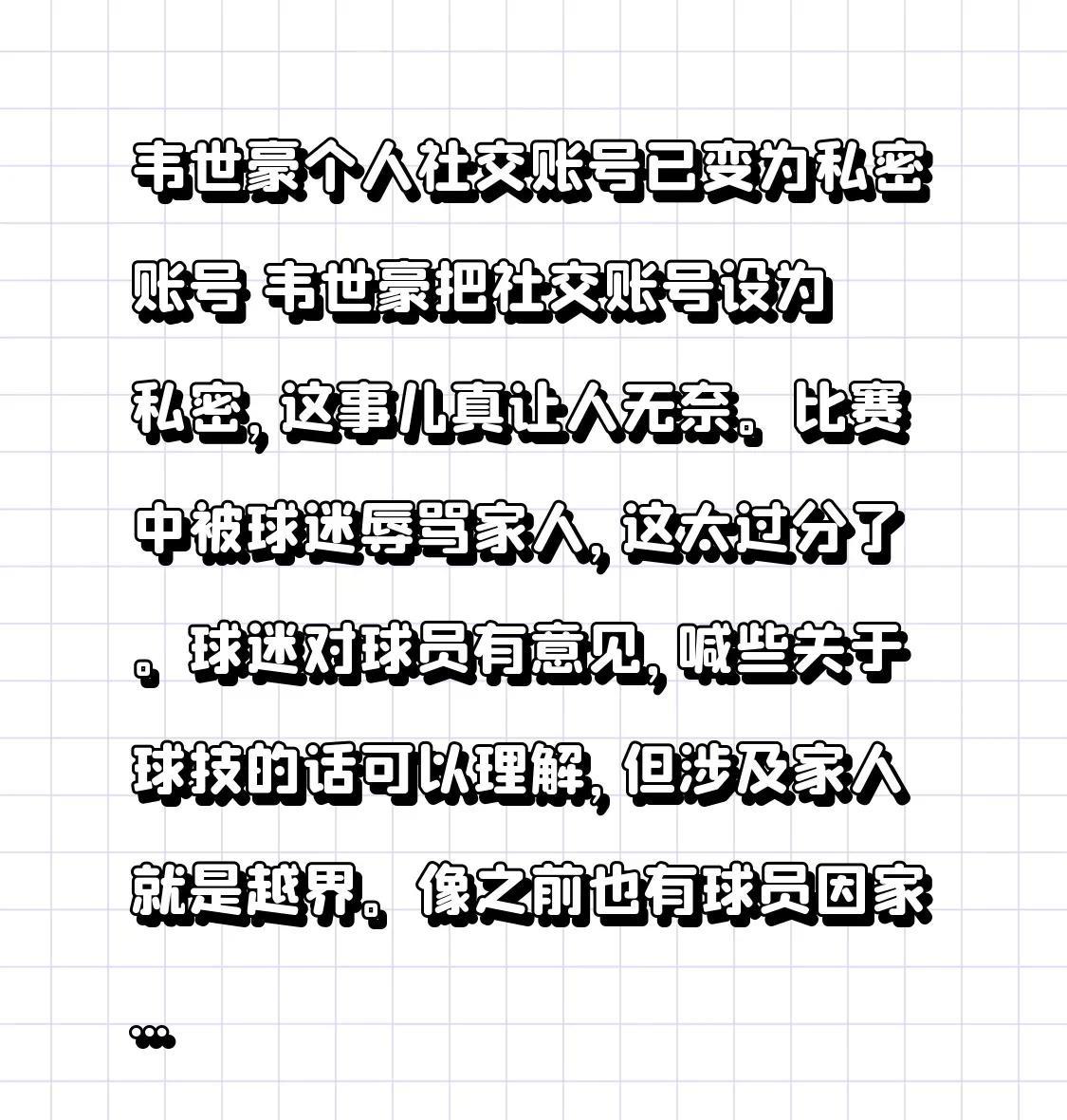 韦世豪个人社交账号已变为私密账号 韦世豪的个人社交账号变成私密账号了。他把社交账号设为私密,这事儿真叫人觉得无奈。 那些骂人的球迷真的应该受到处理,要不然这种不良的球迷文化会把足球给毁掉的。球员在场上是职业身份,在场下也是普普通通的人,他们有家庭,他们的家人不应该被这样攻击。#韦世豪# #韦世豪冲突# #韦世豪进行曲# #运动社交密码#