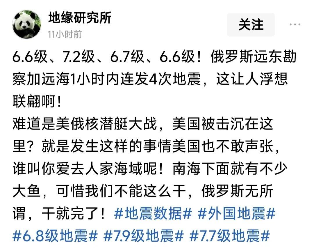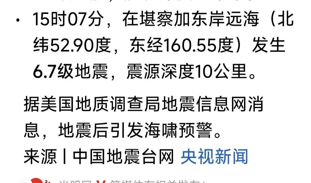 俄远东堪察加边疆区发生强烈地震!1小时4次,分别为6.6/7.2/6.7/6.6级。引发网友热议,说什么的都有。 有人说俄在搞核爆,是警告美欧乌! 有人说美核潜艇被击沉,引发核爆! 有人说是苍天预警,也是一种昭示! 这些说法都无根据,应是自然灾害吧!堪察加地处地震高发区,有众多火山群,每隔30年左右,都要喷发一次。 最近一次喷发,是1972~1974年。这次地震,是否是喷发期前兆或者另类表现呢?如果是的,是否有点延后了? 至于网友的猜测,应该是对俄乌战争的关注与焦虑,产生的合理想象吧? 地震虽与战争无关,但苍狼还是期望战争早点结束!因为如果处置不当,对俄国家民族伤害,可比地震严重啊! …………