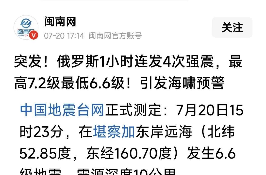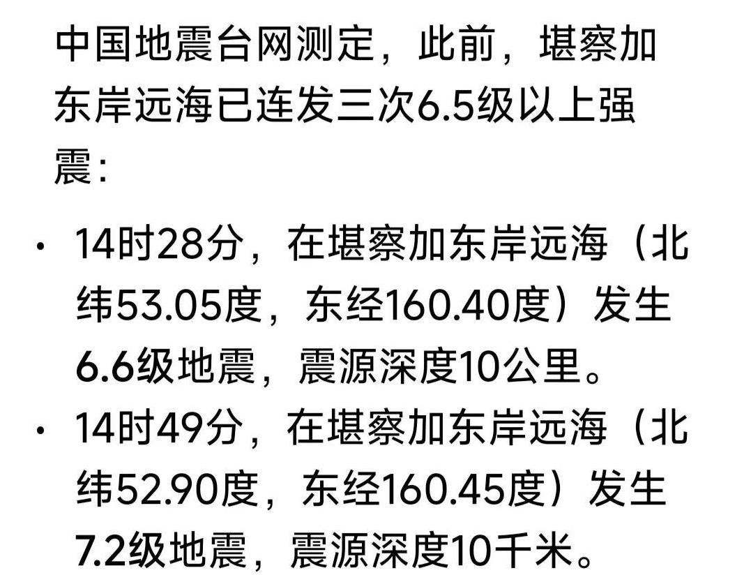 俄远东堪察加边疆区发生强烈地震!1小时4次,分别为6.6/7.2/6.7/6.6