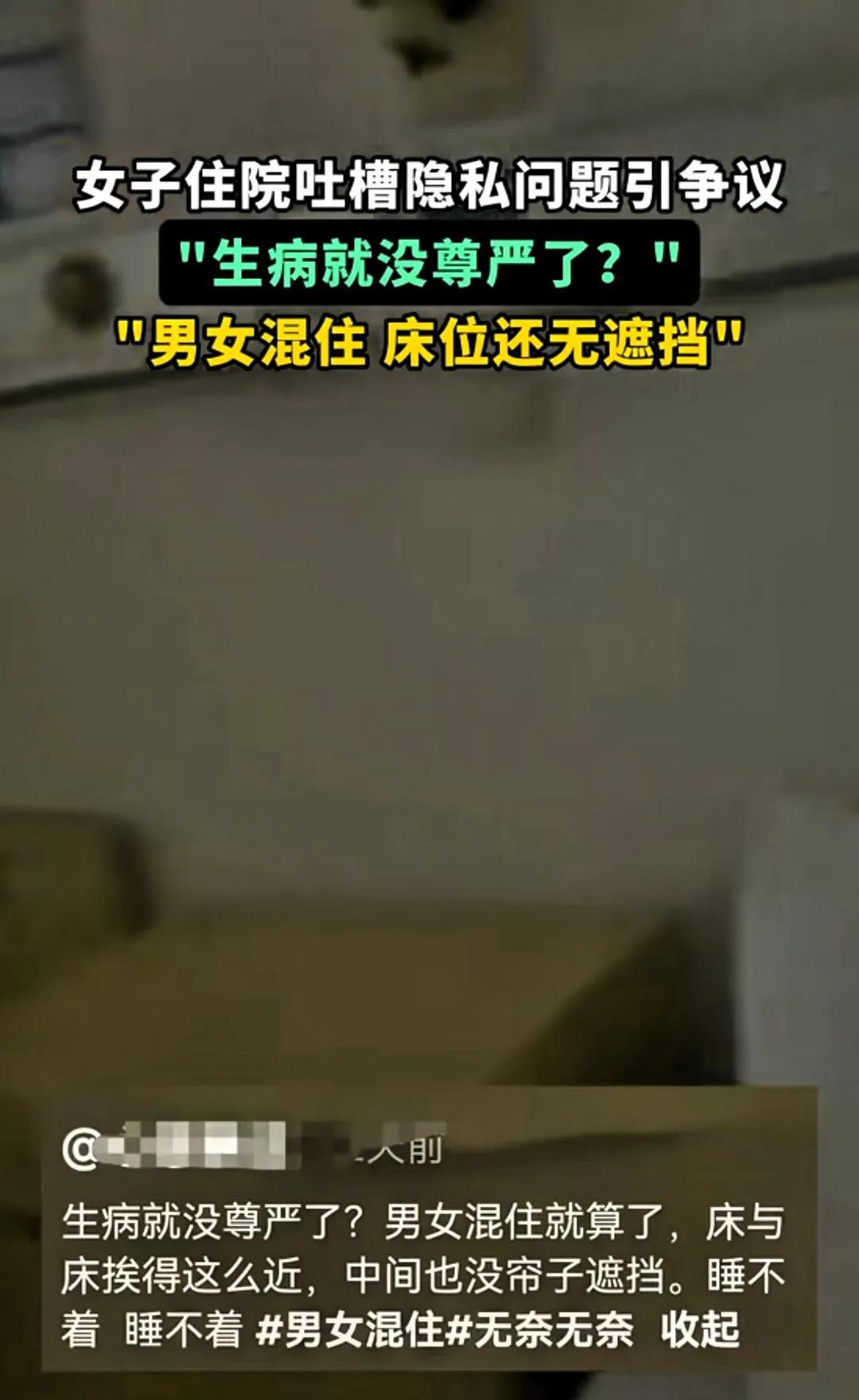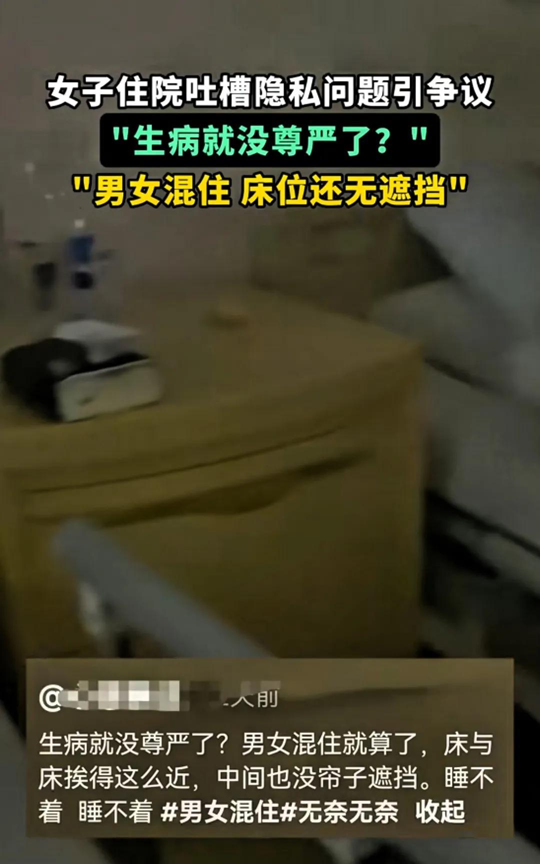 “太膈应了!”广东,一女子生病住院,才住一天就想回家,住进病房后她发现竟是男女混住,且无帘子遮挡,她床位在中间,一边是个老头子,另一半是个男的,女子毫无隐私可言,到了晚上根本睡不着!女子吐槽:生病了就没尊严了吗? 女子生病住院,选了普通病房,住进去才发现病房里有4个床位,床与床挨得很近,活动很不方便,床挨得近就算了,关键还是男女混住,而且中间连一个遮挡的帘子都没有安装。 女子的床在中间,她两边都睡着男的,女子心里很膈应,不是滋味,但又很无奈,谁叫自己生病了呢!可生病了就没尊严了吗? 女子将自己的经历发到网上,不料引起网友争议。 有网友觉得女子矫情,表示:要隐私就花钱住单人间,人生病了,救命要紧,希望早点康复,哪有心思和精力去想那些乱七八糟的东西,去看那些护工,给病人洗脸,洗脚,擦身,尴尬吗? 有网友说:床位紧张,很多患者是住走廊,更没尊严。 还有网友说,如果拉个帘子,万一有不轨的坏人,那干坏事就更容易了。 可我认为女子的吐槽不无道理,医院治病救人是一回事,医院的服务又是一回事,病人有需求,医院的配套服务也应该跟上。 一块帘子,遮的是隐私,暖的是人心。医院床位紧不是借口,尊重患者体面,才是医者仁心该有的温度。 对于女子的吐槽,你怎么看?