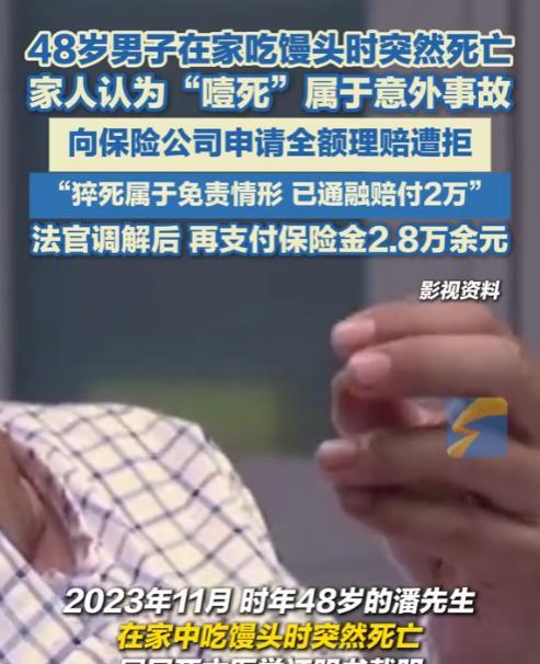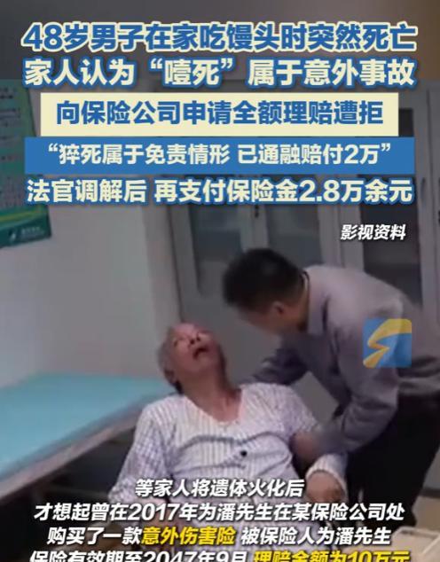 “骇人听闻!”上海,一48岁男子在家吃饭时,因为吃馒头被噎住而猝死,因为男子生前曾购买了意外伤害险,因此在为男子处理后事后,男子家属找到保险公司索赔。可保险公司竟然以吃馒头噎死不属于意外事故为由,拒绝理赔。男子家属一气之下将保险公司告上法庭,法院判了! 2025年7月19日,上海浦东新区人民法院对外公布了一起保险理赔案件。 2023 年 11 月,上海48 岁的潘先生(化名)和母亲李大娘(化名)一起吃着午饭。 当天中午李大娘从超市买了一些馒头,而在吃午饭的时候,李大娘先把馒头放到了餐桌上,自己则回到厨房继续炒菜。 为了等母亲,潘先生就现在外面啃馒头吃,可令他没想到的是,自己竟然会被馒头噎住。 在被噎住后,潘先生的脸一下子涨得通红,紧接着猛地从椅子上滑下来,重重摔在地上,没了动静。 厨房里的李大娘在听到动静后立刻赶了出来,却发现儿子已经躺在地上。 看到这一幕,李大娘整个人都僵住了,好半天才反应过来,颤抖着想去扶,可却怎么也使不上劲,最后李大娘忍不住的哭了出来。 邻居听到李大娘家里的动静后立刻敲门询问情况,在得知潘先生昏迷后立刻帮忙拨打了 120。 可当潘先生被送往医院后,潘先生已经没了心跳,医生检查发现,他的口腔和咽喉里还卡着没咽下去的馒头碎屑。 居民死亡医学证明书载明,潘先生的主要死亡原因为“猝死”。 在处理完潘先生的后事之后,家人整理遗物时翻出了一份 2017 年买的意外伤害险保单,保单上写着被保险人是潘先生,保险期能到 2047 年 9 月,保额 10 万元。 家人拿着医院的证明找到保险公司,觉得潘先生明明是吃馒头噎死的,这肯定算意外,理应获得理赔。 可保险公司工作人员却说:“猝死不在意外险理赔范围内,这是合同里写明的免责条款。” 保险公司还拿出潘先生之前的就诊记录,说他本身就有多种疾病,身体状况不好,可能是身体其他疾病导致的猝死,无法因此判断是因为被馒头噎住导致的。 家属实在咽不下这口气,明明医生都看到喉咙里有馒头,怎么就不算意外了? 他们一纸诉状把保险公司告到了法院,要求保险公司全额进行赔偿。 主审法官了解情况后指出,现在很多保险公司都在合同里把猝死列为免责项,但医学上猝死的原因可不止疾病一种,要是因为非疾病因素猝死,保险公司依旧需要按合同进行理赔。 可麻烦的是,潘先生的遗体早就火化了,没法做进一步鉴定,到底是疾病还是噎住导致的猝死,没了最直接的证据。 因此保险公司这边也不松口,说家属没第一时间报案,现有的证据不足以证明是噎死的,而他们出于同情已经理赔2万元,不可能继续赔偿了。 考虑到继续打官司耗时耗力,再加上潘先生家人实在是拿不出其他证据,因此法院出面进行调解。 最后,保险公司在通融赔付2万元的情况下,又向潘先生赔付了保险金2.8万元,双方对此并无异议。 对此,大家又是如何看待的呢? (信息来源:环球网——2025-07-21《48岁男子吃馒头噎死!母亲当场吓呆,家人崩溃:申请全额理赔遭拒绝》)