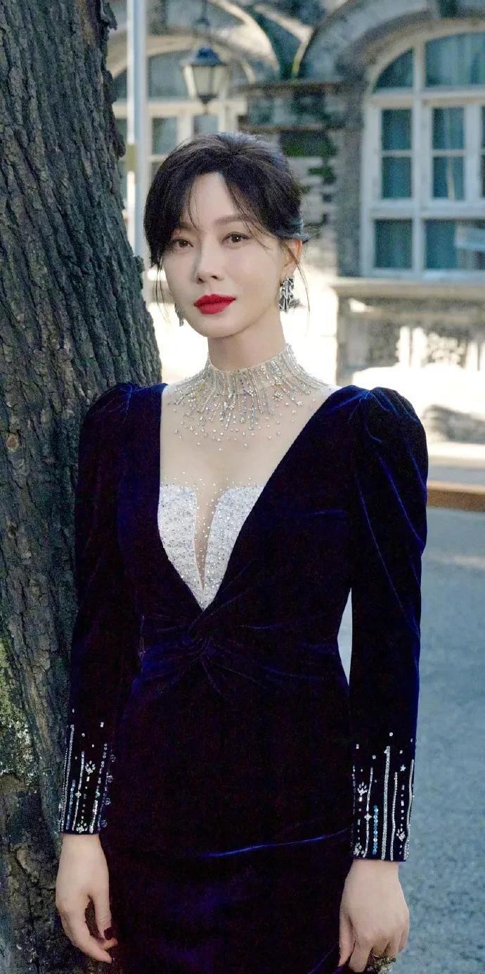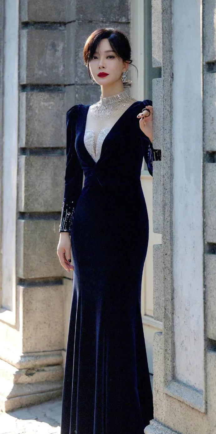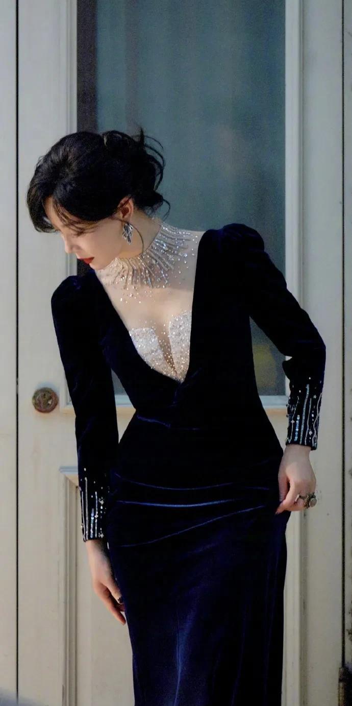 陈数穿丝绒深V裙,曲线简直逆天!钻链衬得皮肤发光,红唇配优雅神态,随便一站,气场