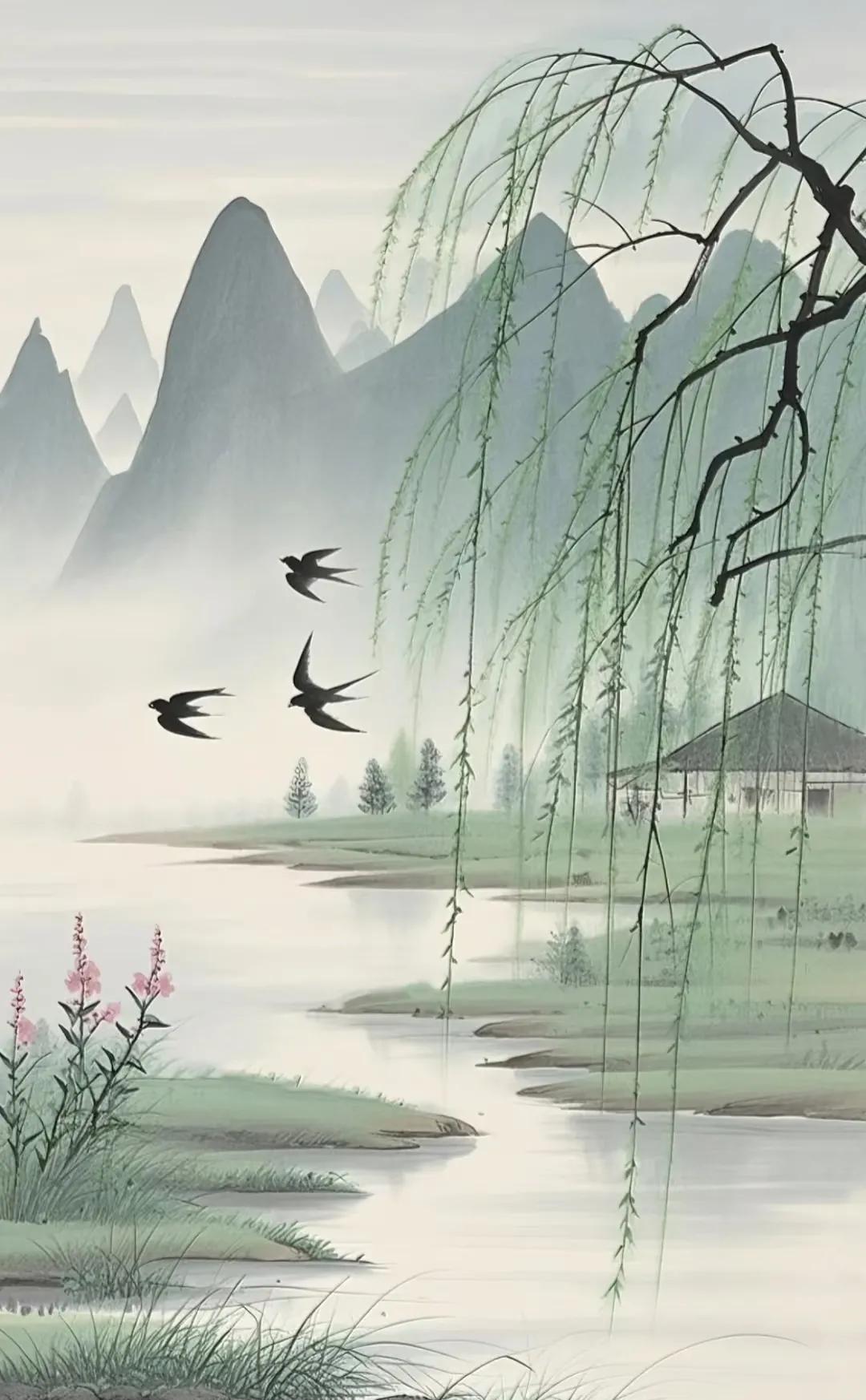 远山朦朦映清泉, 花草碧绿柳弯腰, 春意不知早来到, 燕子筑巢报春晓!