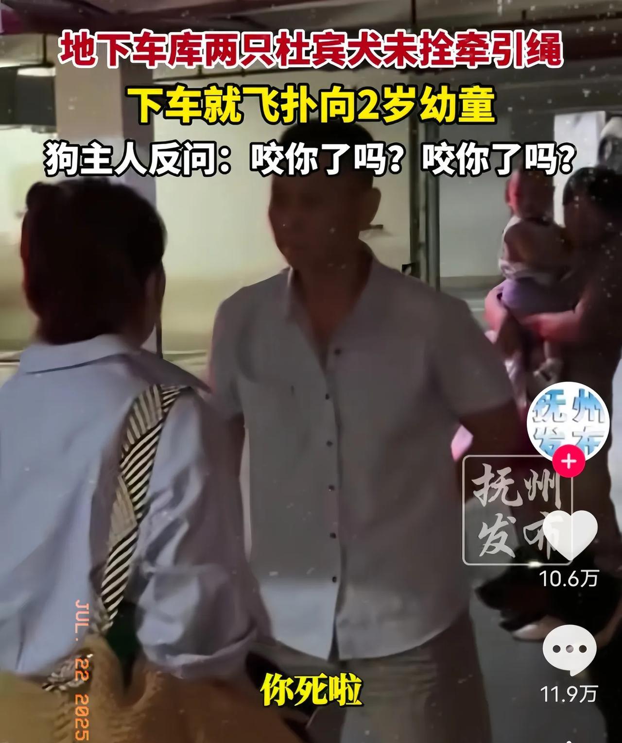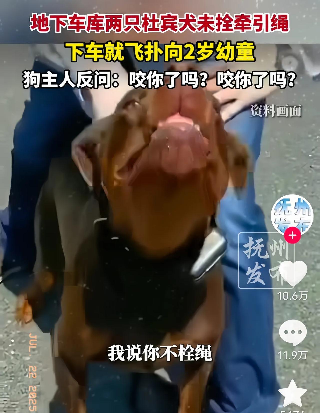 这个事情闹得不小,我也喜欢狗,但出门遛狗一定会做好防范。7月18日发生在江苏镇江丹阳的一件事,引发了网友们的热议和讨论。 当天李先生开车回家,路过小区地下车库时,突然冲出两只杜宾犬,吓得他两岁的孩子大哭不止。李先生气冲冲地下车,指着狗主人说:“谁家的狗,不拴绳打死它。” 没想到狗主人的态度十分蛮横,说:“狗咬你孩子了吗?咬你了吗?李先生越想越气,于是把事情经过录制成视频上传到网上并且报了警。 没想到事情越闹越大引起了网友们的热议,大家纷纷指责狗主不牵绳遛狗,骂骂咧咧的态度也不道歉。还有人说,杜宾犬属于烈性犬,不应该养。 李先生说丹阳这边杜宾犬是不允许养的,警察说会调取监控找到狗主人。网友看完视频后,都表示要是自己的孩子被吓成那样,估计会直接打死那两只狗。李先生说他不是那种打狗的人,但被吓成那样,气头上肯定会打狗的。 很多网友说狗主人要负全部的责任,因为牵狗绳是遛狗人的责任,不管什么狗都要牵绳,杜宾犬属于烈性犬,更加要拴绳遛狗。 还有人说了,这位狗女主人比狗的态度还要恶劣,一定要加强教育。如果当时这位小孩大人不在身边或者换成其他小孩两只杜宾犬突然冲上来,咬了孩子那后果不敢想象,这就属于狗伤人了,狗主人要负全部法律责任的。 由此可见,这件事里狗主人实在太不应该。杜宾犬本就是烈性犬,还不拴绳在地下车库乱跑,吓哭孩子不说,态度还蛮横,真让人难以接受。 小区是大家生活的地方,狗主人不能只图自己方便,不顾他人安全。不拴绳遛狗不仅容易吓到人,要是真伤了人,那麻烦可就大了。 警察介入是对的,得让狗主人知道自己的错误。这也给其他养狗人提了个醒,遵守规则是基本的,别等出了事才后悔。 现在网友热议也是希望类似事情不再发生。大家都希望生活环境安全和谐,养狗人就该负起责任,好好约束自己的狗。 出门遛狗不做好防范措施,还态度恶劣,这种人平时素质可见也就一般,不吃一次亏始终不会彻底改变自己。 不知道各位怎样认为呢?欢迎评论区聊。#城市养狗禁令# #养狗伤人# #小区禁养宠物狗# #禁止带狗# #无绳恶狗伤人# #宠物嫉妒心理# #江阴丢狗# #南京杜宾犬#