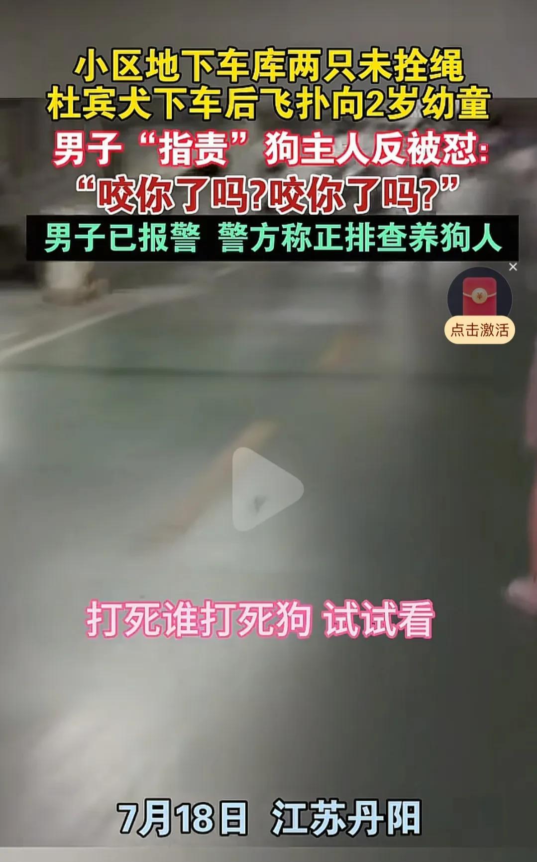 两只杜宾犬让丹阳名声大噪,比起狗咬人,更可怕的是主人要咬人的那种嚣张劲,当地也给力,删视频家丑不外扬。警方:已妥善处理。 7月18日,江苏丹阳某小区地下车库,两只杜宾犬未栓牵引绳,下车就飞扑向2岁幼童,引起幼童家长不满,说,“打死它”。 狗主人夫妻俩就冲了过来,“打死谁?打死狗?你试试看,打,你来!”女子态度嚣张,语气咄咄逼人,用手几乎指到了幼童父亲的脸上,“咬你没有?咬你了吗?……” 这段视频在网上疯传,网友个个气得牙痒痒,非得等咬上了才制止?这是拿别人的生命开玩笑。 幼童家长还是很理智,如果是碰到与狗主人一样的当事人,那根手指得交待在那。 当事人也是气愤不过,将视频发到网上,你不是有理吗?让大家评评,并报了警。 警方也很积极,得首先消除影响,不能给当地抹黑,当天就联系当事人删视频。 通过警方与物业的逐家排查,狗主人找到了,称己妥善处理。 很多人好奇是怎么处理的,毕竟杜宾犬是明文制止养的大型犬,有相当的攻击性,不仅没栓绳,没戴嘴套,而且这主人攻击性也强,不惩治会有更严重的后果。 其实没必要藏着掖着,正视问题,实事求是将惩治结果大方的公布于众,比用嘴宣传更有力度。 天狂必有雨,人狂必有祸。狗主人可能会面临行政拘留或罚款,就当买个教训吧,如果不是这事,估计迟早还得出事。