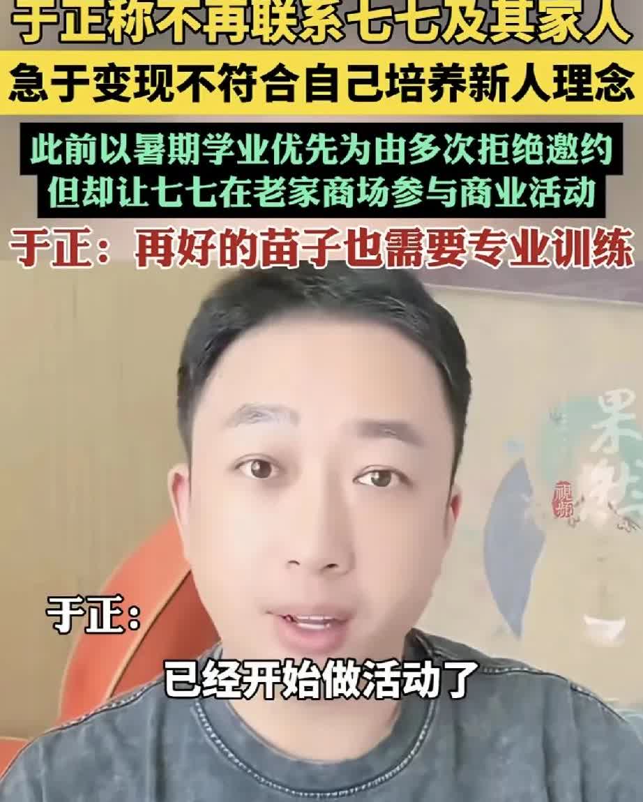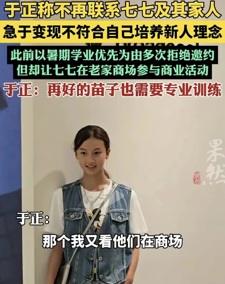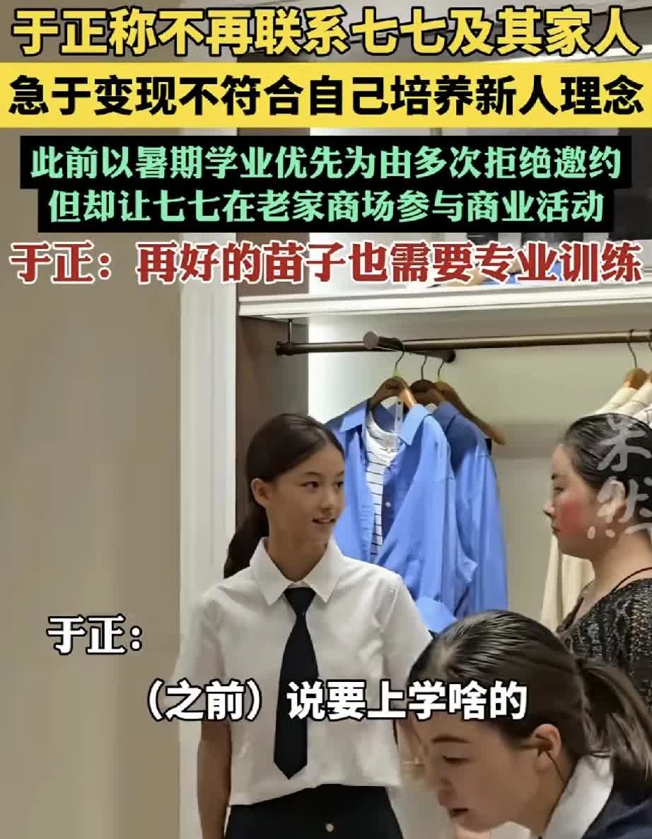不签就对了 典型的得不到就毁掉 七七妈妈做得对 于正发声,说以后不再联系七七和其家人,因为之前以学业为理由拒绝他的签约,现在却在商场参加活动,暗指什么一目了然,没安好心 不得不说,幸好没签,要知道,一旦签约,就全归公司管了,他会在最短的时间榨干所有的利用价值,所谓的培养大多时候不存在,网红本来就这样 所有的时间,所有的行程,全部都由公司决定,还学习什么 不签约,在老家附近参加个活动,能赚点钱,也不耽误学习,多好,最主要自己说的算 其实这样挺好,也有钱赚,同时也避免让自己的女儿上餐桌,大家觉得呢