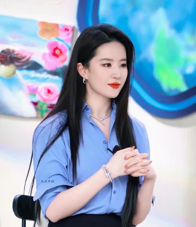 刘亦菲留气质中长发,身穿蓝色衬衫搭配黑色西装裤,真干练大方显气质