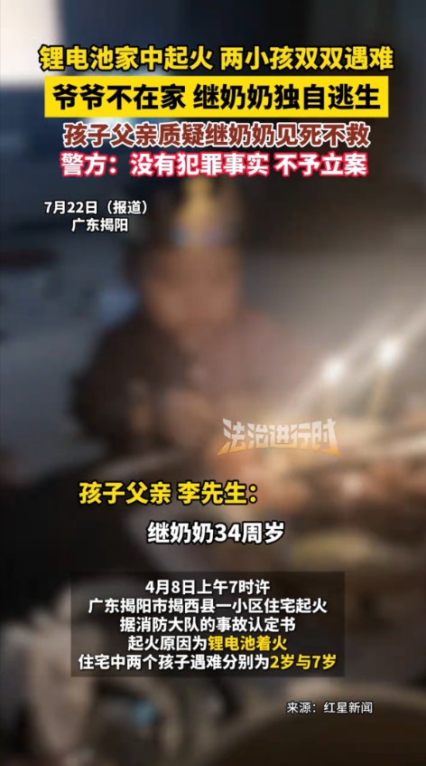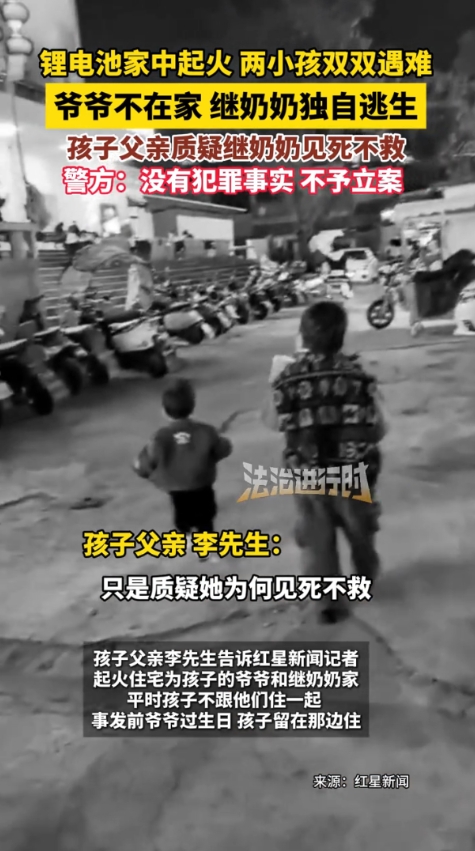 广东揭阳,两个孙子给爷爷过完生日住在了爷爷家,不想第二天清早爷爷家发生火灾,爷爷恰巧不在家,34岁的继奶奶选择了独自逃生,还在熟睡中的两个孙子双双毙命。儿子质疑继母为什么没有救孩子,想追究继母的法律责任,但公安机关没有立案。