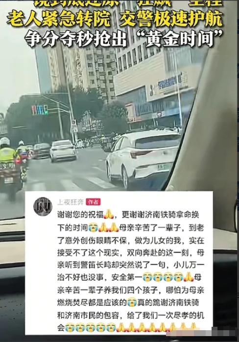 “济南交警救了我妈一只眼!”儿子在病房外长长地舒了一口气,也在社交平台上写下感谢之词: