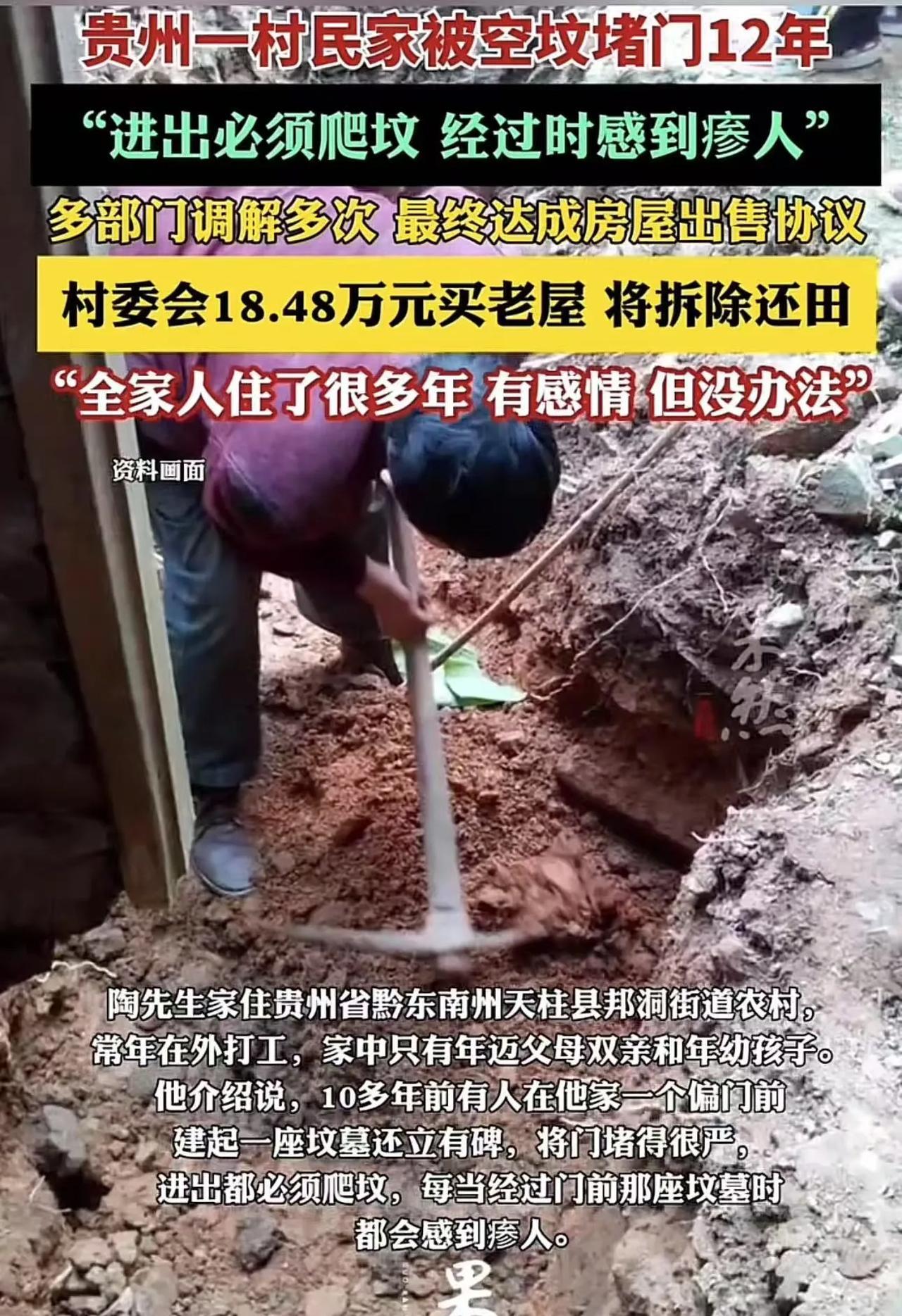 “欺负老实人!”贵州,男子出门打工,家中只留老人,族长竟然在他家门口建了一座空坟,一堵就是12年!男子:“老人和孩子进出必须爬坟,经过时感到瘆人!网友:凭空在人家家门口建坟墓,这得多欺负人?这不是赤裸裸的寻衅滋事吗? (来源:齐鲁壹点) 陶先生的老家在一个偏僻的山村,为了养家糊口,他不得不得背井离乡外出打工。 10多年前的一天,族长突然带着一群人来他家门口掘地,说要寻找500多年前的祖先遗骸。 可是挖了几天什么都没挖到,族长没有善罢甘休,让人在陶先生家门口建了一座坟墓,还立了碑,将陶先生的门堵的很严,进出都必须爬坟。 当时,陶先生家里只有老人和孩子,而且是族长的命令,他父母也是无可奈何,结果这一堵就是12年,令陶先生一家苦不堪言。 而这期间,陶先生不断向有关部门反应,虽然各级部门有组织调解多次,但一直未果。 县法院也以不属于法院民事案件处理范畴为由,作出驳回陶先生诉讼请求的裁定。 陶先生觉得欺人太甚,还不是因为对方是族长吗?如果反过来自己在族长家门口建坟,估计早进去了吧? 可是胳膊拧不过大腿,这样的房子没法住,陶先生认输了。 最终,他同意村委会给的方案,把房屋以18.48万的价格卖给了村委会。老房拟拆除,原址只允许耕种。 陶先生表示,父母年事已高,因自己常年在外房屋拆除后,父母只有暂时居住在姐姐家。家人在老房子居住了很多年,对房子早已有感情,尽管不舍,但实在没有办法! 此事引发了热议,有网友说,为什么不拆空坟而要拆房子?不管如何,一个基层干部和组织不能解决一个空坟,可想这是什么? 也有网友说,先有房后有坟这不欺负人是什么?族长真坏呀,是与这家人有仇,故意恶心人吧? 还有网友说,18.48万能在城里买房吗?只给这么点钱打发,一家人连住的地方都没有了! 陶先生的遭遇令人唏嘘不已,族长凭借所谓的“权威”,做出在他人门口建坟堵门这种荒唐且霸道的行径,一堵就是12年,让陶先生一家长期生活在痛苦与无奈之中,这无疑是对他人合法权益的公然践踏! 而相关部门多次调解却未能有效解决问题,县法院以不属于民事案件处理范畴为由驳回诉求,这反映出基层治理在面对此类复杂且带有传统宗族色彩的纠纷时,存在机制不完善、处理手段有限等困境。 法律本应是维护公平正义的最后一道防线,却在此次事件中未能充分发挥作用,让受害者求助无门。 陶先生最终无奈卖房,这一选择背后是深深的无奈与心酸。房子承载着一家人多年的回忆与情感,却因这样的无理之举被迫舍弃。 相关部门应不断提升治理能力,破除陈规陋习和宗族恶势力,让每一个人都能在公平、公正、法治的环境中安居乐业,真正保障人民群众的合法权益。