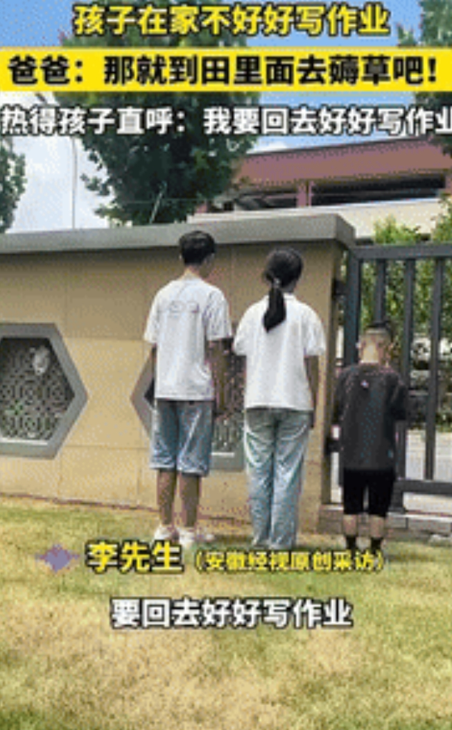 “这下后悔了吧!”安徽阜阳,一男子因孩子在家不好好写作业,将其带到田里薅草,不料,孩子们没待多久就受不了,热的直呼要回去写作业,可男子却没放他们回去,并告诉他们:吃不了学习上的苦,就要吃生活上的苦! 7月22日报道,安徽李先生有一个头疼的事情:两个儿子放暑假了,不好好写作业,天天就知道玩游戏,他在身后多次催促孩子们写作业,可学习进度很慢,一早上孩子磨磨唧唧就写一点。 为了让孩子完成作业,他是好话说尽,采取各种方式,如果孩子们每天把作业按时完成了,可以让他们看一小会儿电视,玩会平板,或者给他们零花钱,让他们出去买东西吃。 可是这些“奖励”,对儿子们来说诱惑不大,每次李先生这样说的时候,孩子该不写还是不写,两人一会跑到沙发上玩耍,一会找借口口渴了喝点水,要么肚子疼上厕所。 李先生觉得必须让他们吃点苦,不然不知道学习是多么好的事情。如果暑假他放养不管孩子,那么孩子的课程一定是跟不上节奏的,成绩一落千丈,到时候开学了,他就会被老师请到学校谈话,这是李先生不想面对的。 此前,他多次给孩子们说一定要好好学习,这样日后才不会后悔,不然他们学习不好,今后就要到厂里打工拧螺丝,到工地顶着大太阳干重活,每次孩子们听到这话的时候,就会不耐烦,这种话挺的实在是多了! 李先生也不想跟他们废话了,便直接将他们带到老家的田地里,让他们跟着自己干农活,将地里的杂草都给薅了。 孩子们刚开始特别有劲,觉得自己不用写作业,能到田地里玩,说不定能发现什么虫子呢,俩人高兴地不得了,认为只要不写作业干什么都行。 刚到地里的时候,他们带着手套,蹲在地里拔草,像模像样的。结果还没过几分钟,就有些受不了了。因为当天室外的温度很高,38°39°的样子,两个孩子没一会头上全是汗,口渴的连话都说不出来。 这时候他们都告诉李先生想回家写作业,不想薅草了,又热又累,太难受了,还没有水喝!他们站起来看到一大片田地密密麻麻的,有很多杂草需要薅的时候,崩溃了,没想到会这么累。 他们以为自己只要服软,不想薅草了,李先生就会带他们回去,可万万没想到,李先生不带他们回去,而是让他们继续在地里干活!两个孩子非常很难受,但是只能咬着牙坚持,李先生不休息,他们就不休息,这时候也不调皮了,也不说不写作业了。 其实,李先生这样做不是惩罚他们,而是想让他们知道,干什么都是辛苦的,没有哪一个工作,哪一个任务是不累的,学习同样如此,学习也很辛苦,但是孩子们的任务就是学习,他们不需要考虑别的,只能想着如何把成绩搞好,如何考上好学校。 如果他们现在不好好学习,玩手机,看电视,那么将来就要吃生活上的苦,李先生不想让孩子们走他的老路,也不想给孩子们后悔的机会,作为父亲,他只想给孩子们提供情绪价值,让他们明白是非对错,该奖励奖励,但是做错了,也是要受罚的。 网友们看到李先生的行为后,纷纷表示他做的对,吃学习的苦,就要吃生活的苦。只有亲身经历才能体会其中的滋味,孩子才会长记性! 吃得苦中苦,方为人上人!家庭教育中对孩子的教育必须从小抓起,树立良好的家风,让小孩子从小养成良好的习惯,让孩子明白该做什么,不该做什么。令行禁止,家教严则子女不怠。大家认为呢?