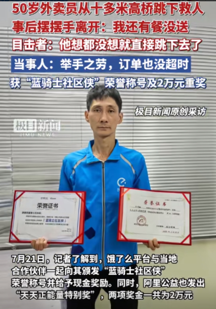 “火到人民日报了!”近日,广东茂名,50岁外卖员经过一座大桥时,突然扔下电瓶车从10多的米高的桥上跳了下去!大家不禁倒抽一口冷气,往下一看瞬间更震惊了,原来外卖员跳水是为了救一个落水的女子!可是他救了人却连名字也不留就跑了! “好在当时的4个单都没有超时,都是刚刚好。”说这话时,50岁的外卖员吕炜权脸上露出了朴实的笑容。谁能想到,就是这个身材瘦削的中年男人,竟然从10多米高的桥上一跃而下,在湍急的河水中救起一条生命。 7月18日那天的高州观山公园大桥上,吕炜权正骑着电动车,后座的保温箱里还装着四份待送的外卖。他习惯性地瞄了一眼手机上的时间,距离最近的订单截止还有28分钟,按照他的经验,这个时间绰绰有余。 然而,就是无意中的一瞥,他却看到一个身影正在水中挣扎。“当时脑子里就一个念头:再不下去人就没了。”没有豪言壮语,没有犹豫不决,这个平日里沉默寡言的外卖员迅速脱下头盔,甩掉鞋子,在众人惊愕的目光中翻过护栏,径直跳入水中。 最终,在随后赶到的民警协助下,吕炜权成功将落水女子救上岸。而当围观群众递来纸巾和矿泉水时,浑身湿透的他却连连摆手:“不用不用,我还有餐要送。”随后,他便跨上电动车,继续未完的配送。 这一幕被路人和监控记录了下来,很快在网络上引发热议。人们纷纷追问:“这个外卖员是谁?他去了哪里?”直到媒体辗转找到吕炜权,这个当时没有来得及留下名字的外卖员才被更多人知晓。而当记者问他为何毫不犹豫跳下去时,他憨厚地笑了笑:“看到有人在水里,哪能想那么多?就是顺手帮个忙。” “其实路上心里挺打鼓的,怕耽误了顾客。”吕炜权后来坦言说。湿透的衣服贴在身上,电动车座垫也全是水,但他硬是凭着对路线的熟悉,在最后时限前完成了所有订单。因为在他看来:送外卖是我的工作,救人也是我应该做的,两件事都不该耽误。 事后,饿了么平台授予他“蓝骑士社区侠”称号,并联合阿里公益奖励他2万元;他的公司也为他送上1000元奖金和一套新装备。然而,面对媒体的大肆宣传,吕炜权却显得有些不好意思:“我就是做了件小事,没想到闹这么大。” 只能说,英雄不必身披铠甲,他们可能就穿着湿透的外卖制服;伟大也无需惊天动地,它就藏在可以准时送达的每一份外卖里。 而就像吕炜权所说的那样:“日子还是要一天天过,单还是要一单单送。”在这个追逐流量的时代,吕炜权依然每天穿梭在城市的大街小巷,继续着他平凡而充实的生活。或许,这就是英雄最真实的模样。 信息来源: 极目新闻|《50岁外卖员从十多米高桥跳河救人,获“蓝骑士社区侠”荣誉称号及2万元重奖。目击者:他想都没想就直接跳下去了;当事人:举手之劳,订单也没超时 人民日报|《50岁外卖员从10余米高桥跳下救人,事后摆摆手离开:我还有餐没送。湿漉的背影令人动容,为你点赞!》