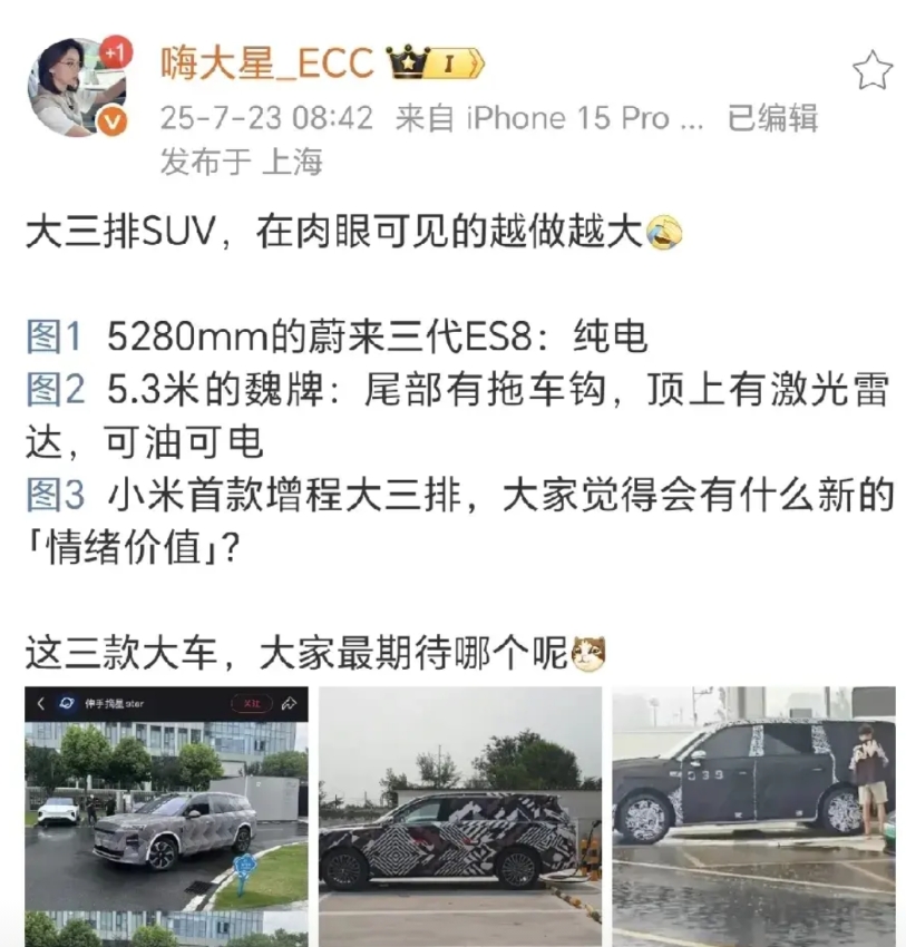 现在全尺寸SUV就是八仙过海,各显神通。 各家密集出车,去年说今年要出十八款大型SUV,算下来差不多。 现在市场大头被问界拿走了,其他家只能抢剩下的份额。 有换电的,有增程的,有插混的,还有纯电的。 至于三电机和后轮转向因为不掌握话语权,成了消费者感知不强的配置了 其实友商一样的车,三电机就是卖的比双电机的贵。甚至2.0T的卖的比1.5T的都贵。 只能说大家一起围剿你,你工程师再努力,没有大喇叭也是不行的 另外理想也是挺累的,这些车出来都会抢一点他的L89份额,所以现在理想等着纯电i86拉升销量了。