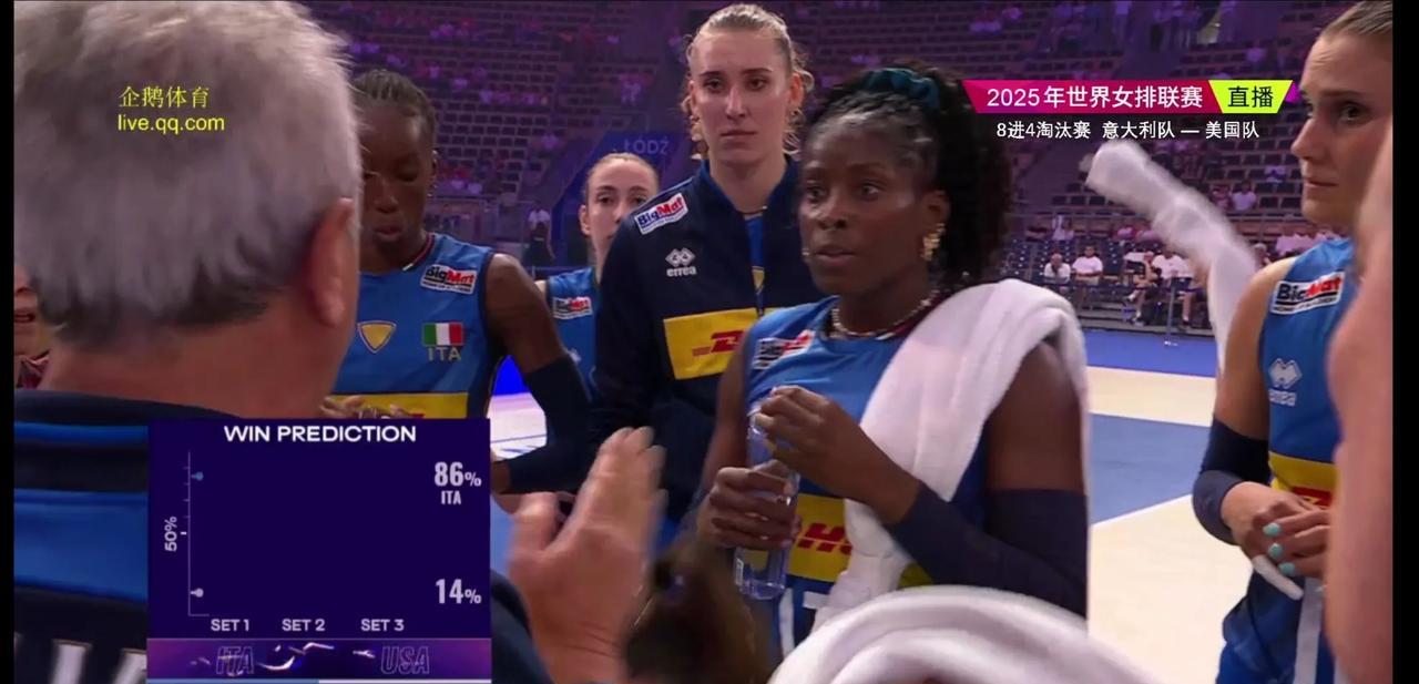 全力以赴的美意两支女排,在第一局打得都较快,前半局美国女排发球破坏意大利女排一攻