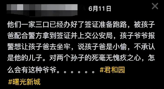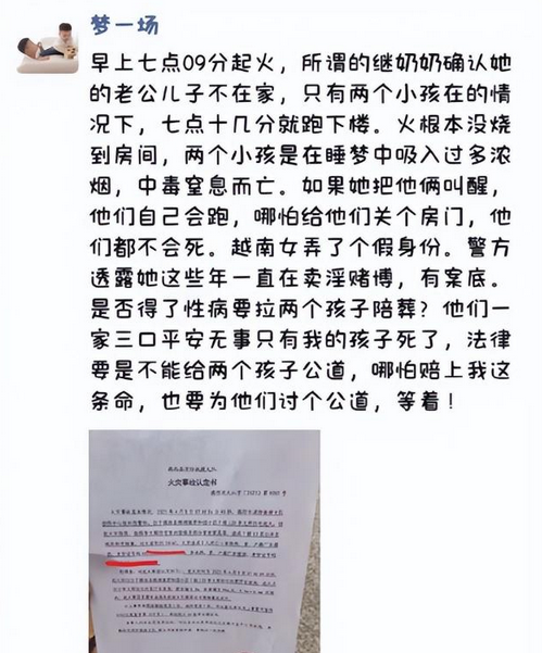 别再说34岁继奶奶狠心了,这个亲爷爷才是“狠”!亲孙子没了,甚至没有哭,没有离婚,反而转移了财产,要带着没有血缘关系的8岁“前儿子”和越南小娇妻跑路! 2025年4月8日清晨的大火,烧掉的不只是一间屋子,更是两个年幼的生命和一个家庭的希望。 直到现在,每当想起那两个7岁和2岁的孩子在浓烟中挣扎的样子,心里都像被揪着疼,这场悲剧里,有太多疑点让人睡不着觉,有太多行为让人寒心到底。 事情得从今年4月7日说起。 那天是孩子爷爷的生日,老人说自己身体不好,常年透析,不知道还能活多久,想多跟孙子们待一会儿。 孩子妈妈一开始没同意,架不住老人再三请求,想着让孩子爸爸第二天一早就接回来,就答应了。 谁能想到,这个心软的决定,成了永远的遗憾。 转天早上6点多,爷爷带着继奶奶生的8岁儿子出门上学了,家里就剩下34岁的继奶奶和两个还在睡觉的小孙子。 没过多久,大概7点出头,大火就烧起来了。 消防后来认定是锂电池着火,但现场看,火是从离大门最远的地方开始烧的。 最让人想不通的是,继奶奶的卧室对面就是孩子睡觉的房间,她发现火情后,二话不说自己从12楼跑了下去,没叫孩子,没敲邻居门求救,甚至没报警。 邻居说,继奶奶跑到楼下大概十分钟后,自己才慌慌张张跑下来,这时候火还没烧大。 也就是说,至少有十分钟的时间,34岁身强力壮的继奶奶完全能一手抱一个孩子冲出来。可她什么都没做,就这么眼睁睁看着两个孩子困在里面。 等消防车赶到的时候,又因为小区消防通道被电动车堵死,消防门还上了锁,只能绕远从大门进来,等消防员踹开门,两个孩子早就没气了,尸检说都是吸入浓烟窒息死的。 孩子父母赶到的时候,天都塌了。 妈妈好几天不吃饭,体重掉得厉害,医生说她重度焦虑加抑郁,还有自杀的念头。 爸爸更是天天自责,怪自己当初没拦住老人。 可这时候,孩子的亲爷爷和继奶奶的反应,简直让人不敢相信。 网传消息称,继奶奶跟没事人一样,该吃该喝,脸上看不到一点难过。 爷爷更过分,火灾第二天就开始转移财产,银行存款全取出来,车也过户给别人了。 到了6月,孩子爸爸发现,爷爷正带着继奶奶和其儿子办出国签证! 为此,爸爸赶紧把签证材料交到派出所,才拦住他们没走成。 被拦住后,爷爷不仅没反思,反而报警说儿子是小偷,想让亲儿子坐牢,还找来一堆亲戚,轮番劝孩子父母别追究了,见劝不动,就放狠话,说自己儿子已经死了,要断绝父子关系。 更让人起疑的是这个继奶奶。 据孩子姑姑讲述,她不是中国人,是越南来的,听说身份都是伪造的,来中国前还有涉黄涉赌的案底。 此外,她比孩子爸爸还小两岁,才34岁,平时对这两个继孙子就不闻不问,社交账号里全是自己和亲生儿子的照片,连一张跟继孙子的合影都没有。 出事那天,她卧室对面就是孩子,就算叫不醒,抱起来跑完全没问题,可她愣是没管。 就在7月21日,警方给出了结果,说继奶奶没有犯罪事实,不予立案,理由是她不是孩子的法定监护人,没有强制救助义务 这个结果出来,谁能甘心?法律上没责任,道德上就一点不愧疚吗? 一个陌生人邻居都后悔,说要是早知道孩子在上面,拼老命也会救,她一个家里人,怎么就能这么狠心? 锂电池着火是意外,但见死不救不是意外,转移财产想跑路更不是意外。 有专业律师对此建议,孩子父母可以通过民事诉讼,要求继奶奶承担未尽到合理救助义务的责任,至少在经济上得到一点补偿。 另外,小区消防通道堵塞的问题也该好好整治,别再让这种客观因素耽误救援了。 两个孩子还那么小,还没好好看看这个世界就没了。 他们的痛苦,父母的绝望,不该被一句“不予立案”轻轻带过,法律或许有边界,但人心不该有冷漠的底线。 希望这场悲剧能让更多人警醒,也希望孩子的父母能早日等到一个真正的答案。 对此,你有什么看法?