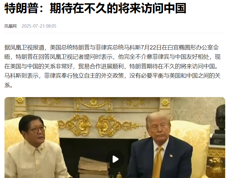特朗普再次表达期待访问中国,而且当着菲律宾小马斯克的面;日前他称与中国的关系非常好,贸易合作进展顺利。 这番表态让正试图在南海扮演美国“马前卒”的菲律宾,陷入前所未有的尴尬境地。 美国宣称《美菲共同防御条约》适用于南海,看似为其撑腰打气;另一方面却对菲律宾商品征收19%的关税,而菲律宾对美出口长期维持零关税。这种经济上的“剪刀差”,让菲律宾在战略依附与利益受损之间进退维谷。 数据显示,2024年美菲双边贸易额中,美国逆差高达49亿美元,但新关税实施后,占菲律宾对美出口50%以上的电子产品价格竞争力骤降19%,成本最终通过供应链转嫁至菲律宾厂商。 特朗普的策略显然经过精心算计,他在强调美中关系的同时,并未放弃对华战略竞争的底色。从“特朗普1.0”到“特朗普2.0”,其对华政策始终将经贸议题置于核心地位,试图通过关税施压与谈判博弈实现“美国优先”。 此次对菲律宾的关税政策,正是其交易型外交的典型体现——用安全承诺换取经济利益,用战略支持掩盖实质盘剥。 尽管美国声称《共同防御条约》适用于南海,但历史经验表明,这种承诺往往停留在纸面上。2024年美菲“肩并肩”联合军演中,美国虽高调参与,却未在南海主权争议中提供实质性支持。 相比之下,菲律宾为表“忠诚”,不仅开放军事基地、推进天价军购,甚至在南海制造事端以迎合美国战略需求,最终换来的却是关税枷锁与经济反噬。 对于中国而言,特朗普的言论释放出复杂信号,美中贸易合作的积极表态为双方关系缓和提供了契机;可另一方面,美国在南海问题上的“口惠而实不至”,再次凸显其地缘战略的双重标准。 中国始终秉持“相互尊重、平等互利”的外交理念,在维护自身主权的同时,致力于通过对话协商解决争议。这种务实态度,与美国的“极限施压”形成鲜明对比。 这场外交棋局的走向,最终取决于各方的利益权衡。 对菲律宾而言,在安全依附与经济自主之间寻找平衡已刻不容缓;对美国而言,如何在战略竞争与务实合作间把握分寸,将考验其外交智慧;对中国而言,保持战略定力、深化互利合作,仍是应对复杂国际局势的关键。 历史终将证明,以牺牲他国利益为代价的博弈,都难以长久维持;唯有平等相待、合作共赢,才是构建持久和平的人间正道。
