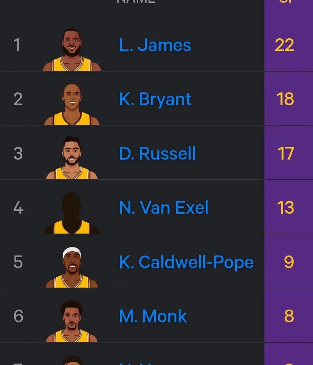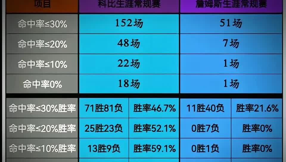 关于詹姆斯的冷知识 1,绝杀次数,这个竟然能拍在第一,属实没想到,不是一直有人说他不敢投关键球吗?图一 2,生涯低命中率的比赛,当老詹命中率低于20%的时候全输!这个好理解,主将如果不在状态,或者主将被对方防死的时候,这比赛一般没啥悬念了,反映的是主将对球队中的重要性。图二 3,湖人队史上,单场命中6个及以上三分球的场次,詹姆斯以22场高居第一,说实话这个记录很意外!不过按照东契奇的这个节奏,最终东77会碾压所有人!