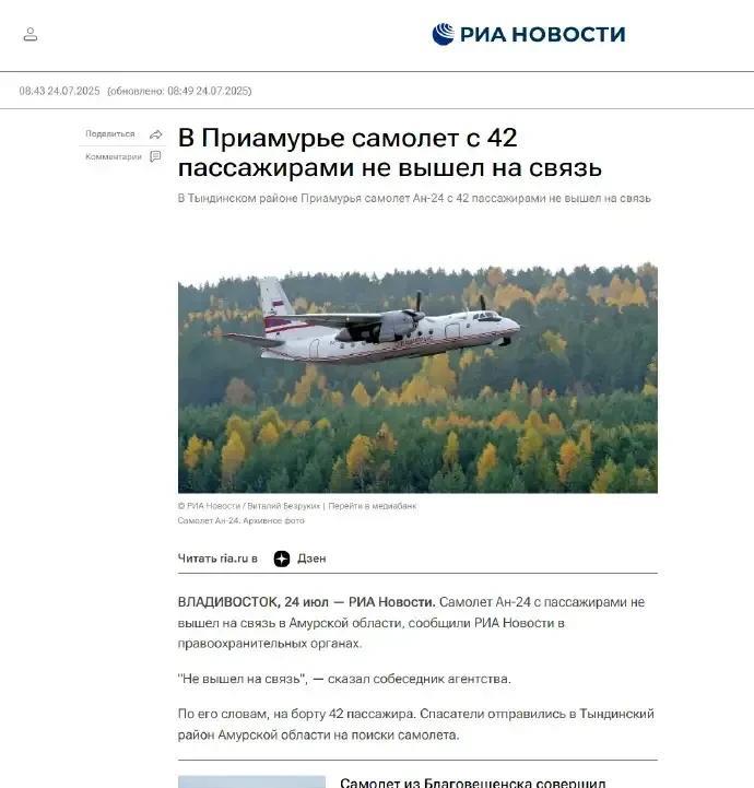 2025年7月24日一架搭载约50人的俄罗斯客机,在俄远东阿穆尔州失联。飞机失联