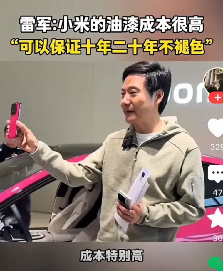 一辆汽车的油漆,要在风吹雨打中历经十年二十年而不褪色,是极为困难的……一般的家用汽车用不起这么昂贵的油漆,其成本非常之高。言外之意,只有小米这种“不一般”的家用汽车,才用得起“这么贵”的油漆。