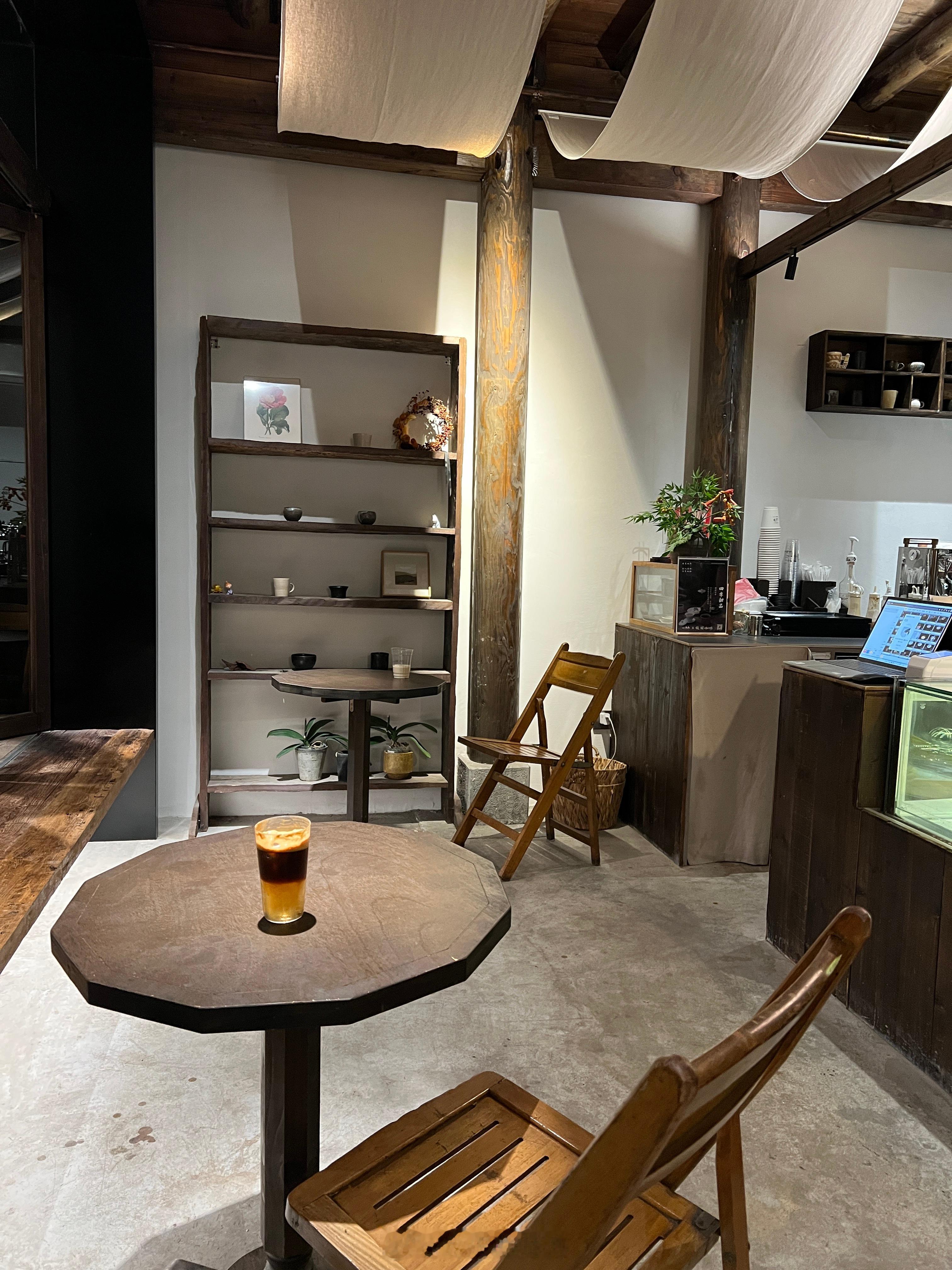一个人在台州葭沚老街闲逛,千篇一律的复古商业街,除了大隐书局外,并没有什么亮眼的所在。即将离开时,偶然发现的【馥丽咖啡】,那门头和推车突然就让我想起了曾经的“老虎的师傅咖啡馆”[摊手],那么便坐下休息会吧。