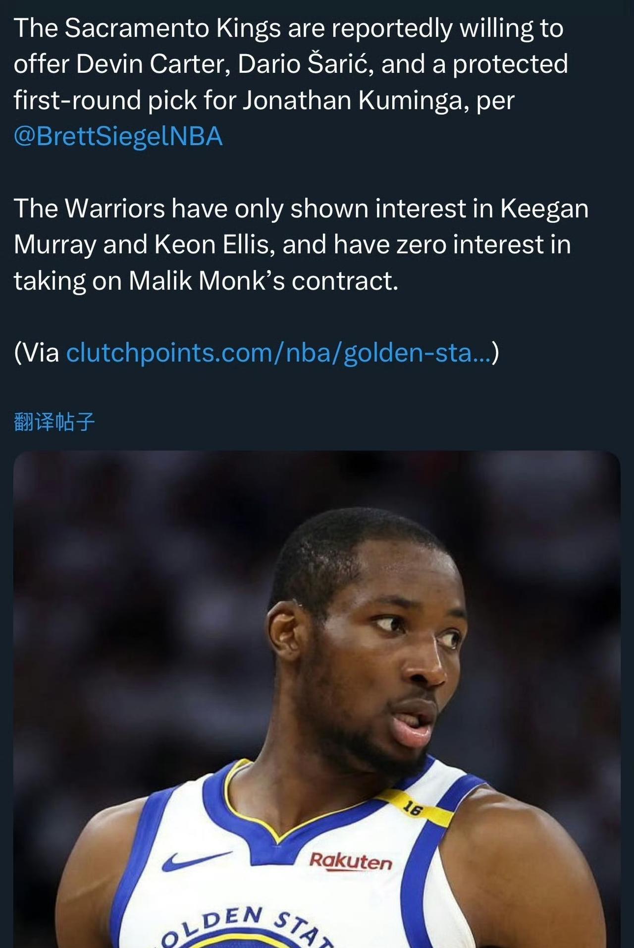 国王有意库明加,但勇士要价过高! 然而,勇士想要的是基根默里和埃利斯,对国王提供