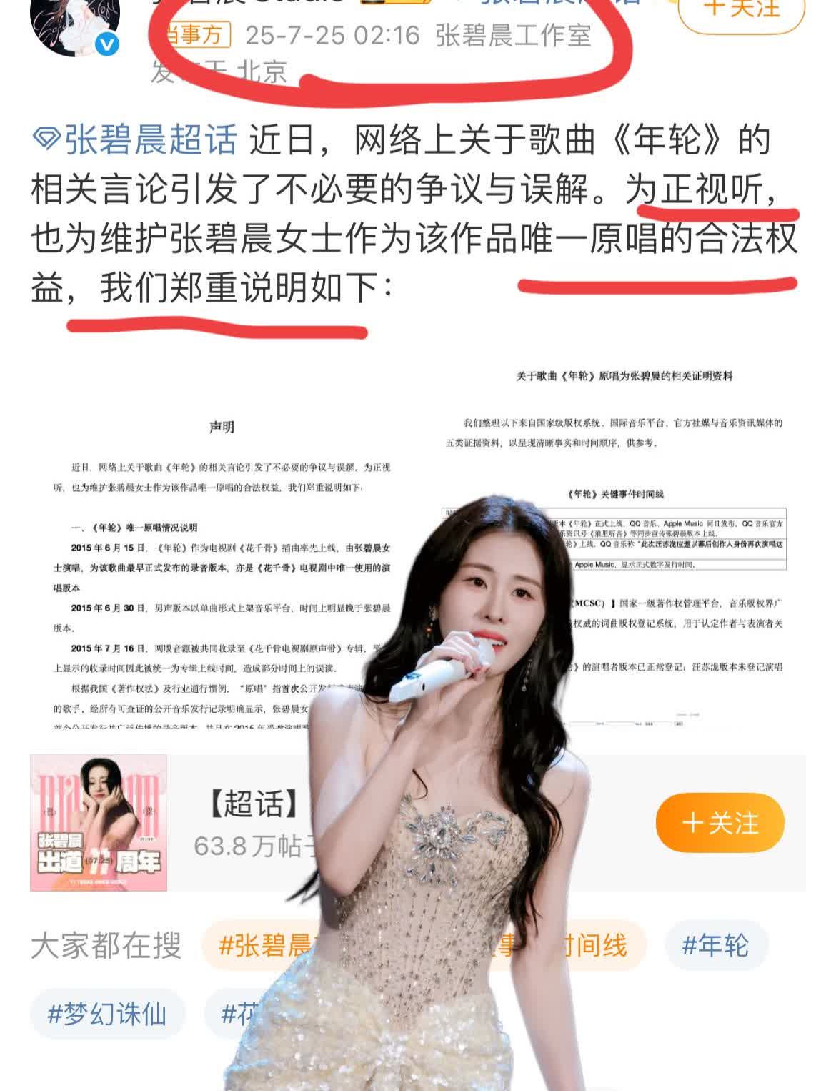 只能说“汪苏泷是个体面人”, 这句话的含金量还在上升。 从发文的时间线可以看出一些端倪。 首先是汪苏泷方在刚过0点时发文:由于近期《年轮》陷入风波,所以汪苏泷做为创作者收回歌曲授权——谁也别唱了。 两个小时后,张碧晨工作室发文:张碧晨告别《年轮》,并且附上了长图来说明、强调张碧晨是《年轮》这首歌的“唯一原唱”。 从先后发文的时间上来看,我大胆猜测: 汪苏泷先是收回版权,这个应该是突然决定且没有告知张碧晨。 而张知道后有些恼羞成怒,毕竟唱了十年的成名曲说没就没,怎么也得争个输赢,所以甩出“证据”证明自己是原唱。 前段时间还手拉手在演唱会上唱歌的两人,现在就只能隔空对话了。 友谊啊……