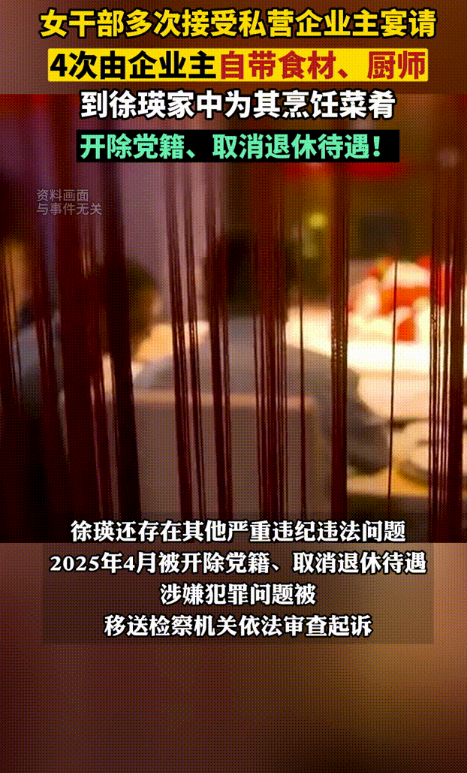 女干部多次接受私营企业主宴请,4次由企业主自带食材、厨师到徐瑛家中为其烹饪菜肴,她开除党籍、取消退休待遇!