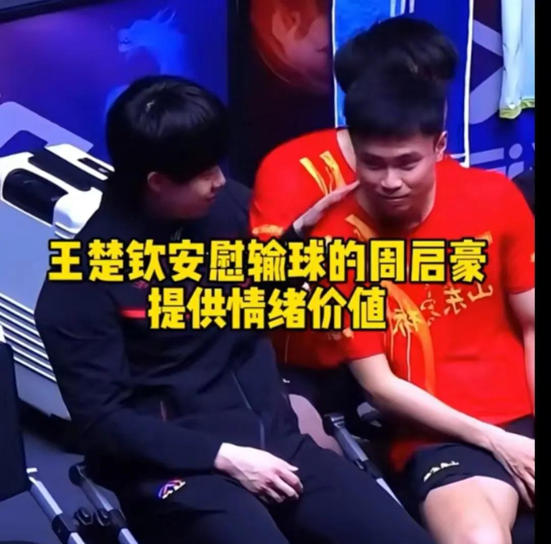 王楚钦你就是个操心的命! 乒超第三天王楚钦调休,没想到没上场的他依旧要操心,场下看比赛还得兼职当教练。不过说实话,双打林昀儒不得搭梁靖崑胜算大,一换成周启豪这不就输了吗? 看把场边的头哥急得,就差点给7号整出三菜一汤了,最后魏桥第 一场双打还是2-3败给安徽中程。 输了球7号下场很自责,王楚钦拍拍他的肩膀安慰队员,看得出头哥是一个很好的人,情绪价值给得很足哦! 王楚钦团队意识很强,虽然自己没上场依旧会尽职尽责的给队友分析战术,如果以后做教练肯定是个好教练。